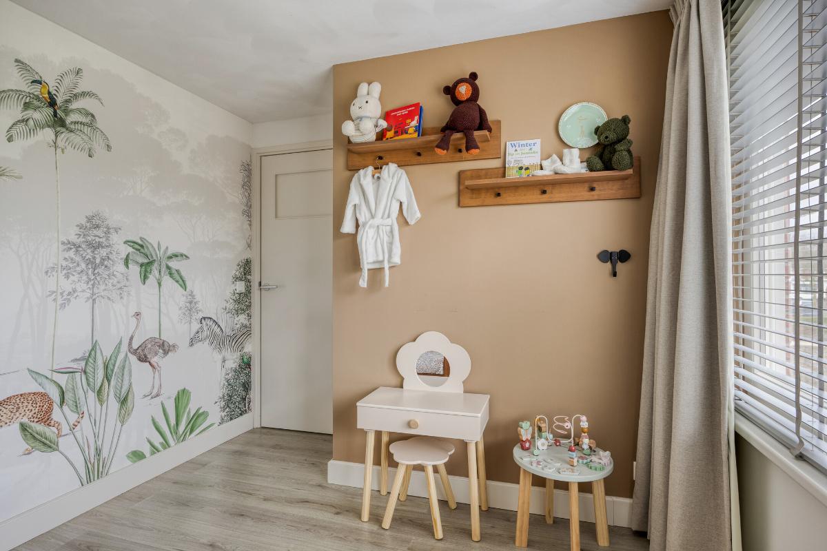 Vanuit de woonkamer heb je toegang tot een praktische bergkast en via zowel een loopdeur als openslaande tuindeuren tot de achtertuin. De gehele begane grond is afgewerkt met een fraaie tegelvloer met comfortabele vloerverwarming en strak gestucte wanden en plafonds.