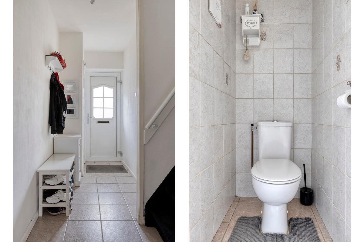 Eerste verdieping Hier bevinden zich drie slaapkamers van goed formaat, ideaal voor een gezin en met ruimte voor een eventuele thuiswerkplek. De kleine badkamer beschikt over een douche en wastafel.