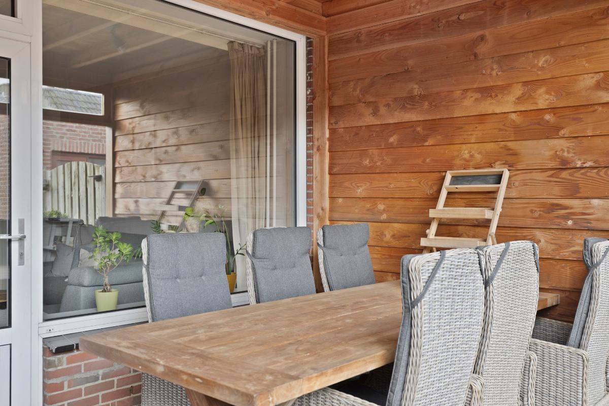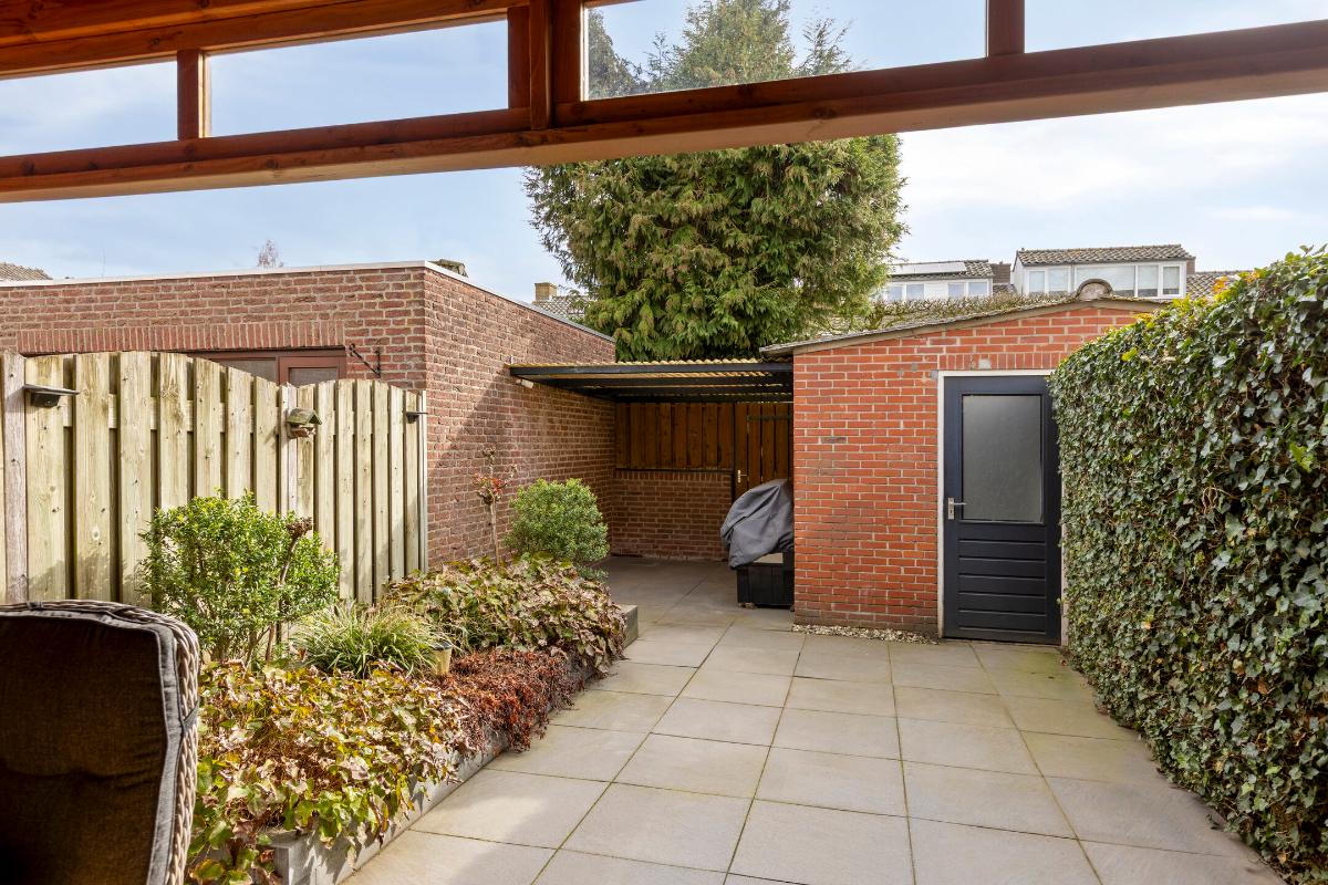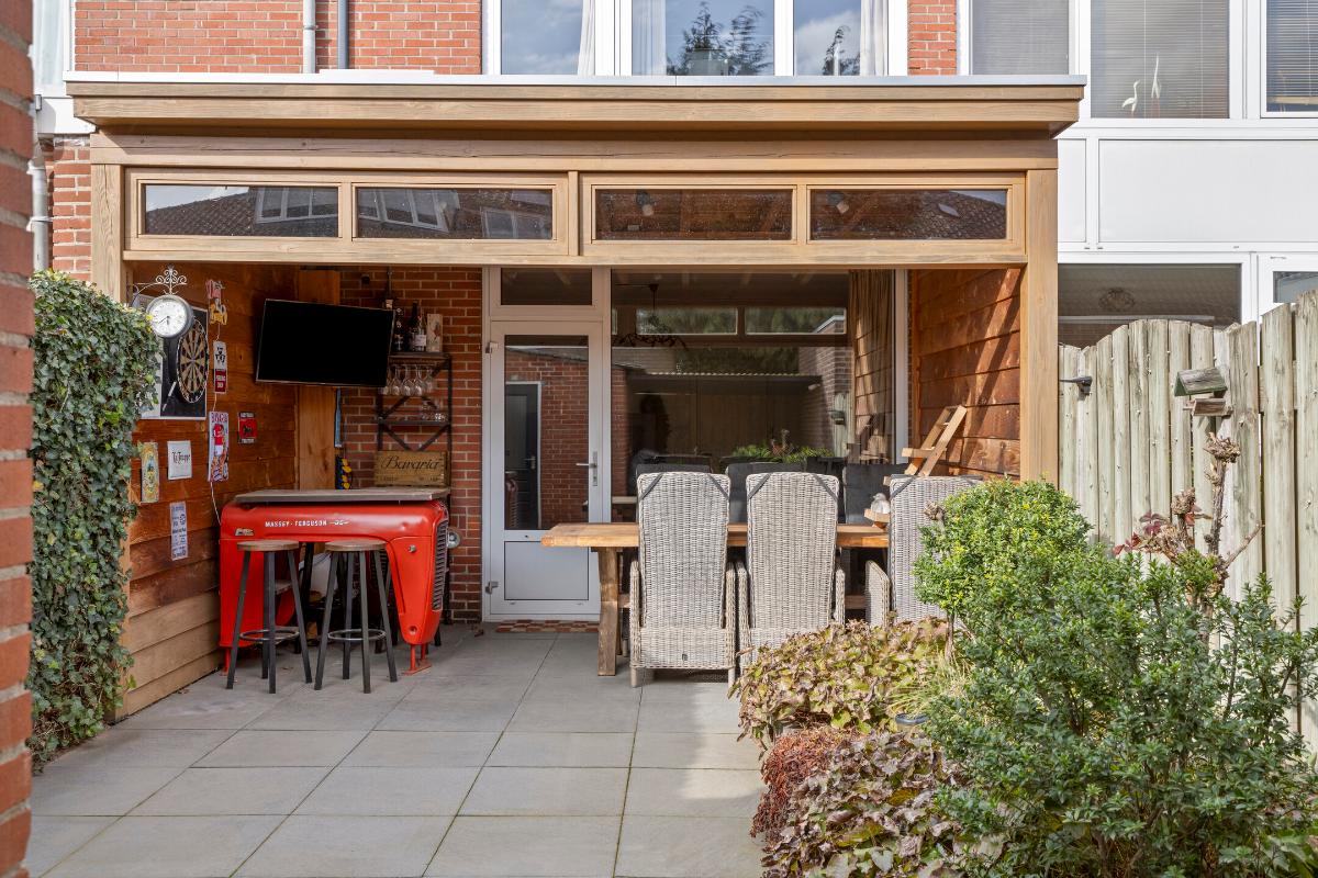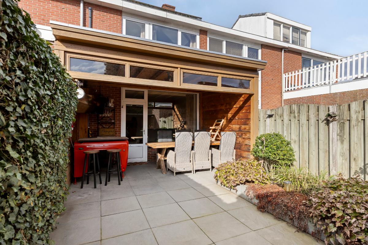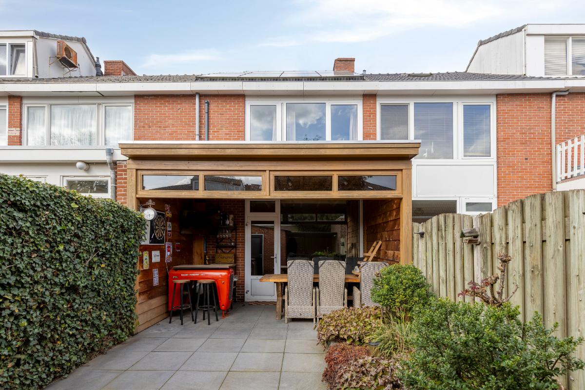 De achtertuin is een heerlijke plek om te ontspannen. Dankzij de ligging op het zuiden geniet je hier volop van de zon. De aanwezige overkapping zorgt ervoor dat je ook op minder zonnige dagen comfortabel buiten kunt blijven zitten. Daarnaast is er een praktische berging met overkapping en een achterom aanwezig.