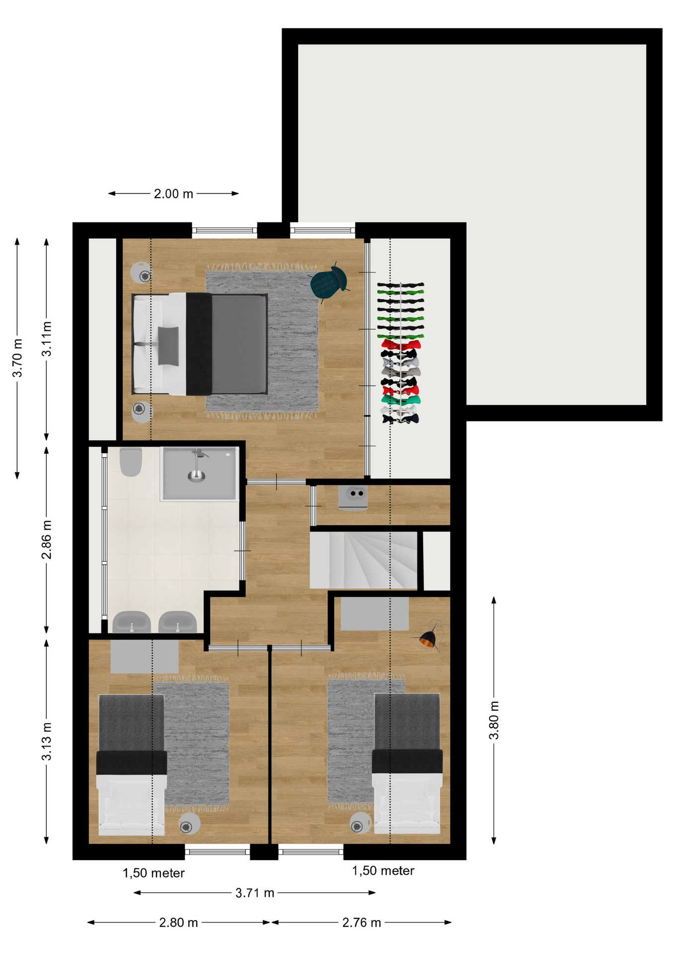 INDELING: Begane grond: entree/hal met toilet (wandcloset met fonteintje); een royale L-vormige woonkamer met open keuken (samen circa 38m²). De moderne keuken is voorzien van een inductie-kookplaat, rvs-afzuigschouw, vaatwasser, koel/vriescombinatie, heteluchtoven en combimagnetron. Direct naast de keuken bevindt zich de bijkeuken met wasmachine-aansluiting. Via de aangebouwde serre (circa 10m²) toegang tot de tuin en binnendoor naar de garage. Eerste verdieping: overloop, drie slaapkamers (circa 15, 10 en 9m² vloeroppervlakte), waarvan de grootste met een vaste kastenwand. De moderne badkamer (met dakkapel) is voorzien van een wastafelmeubel, ruime inloopdouche en wandcloset. Tweede verdieping: via vlizotrap te bereiken bergzolder (met stahoogte!).