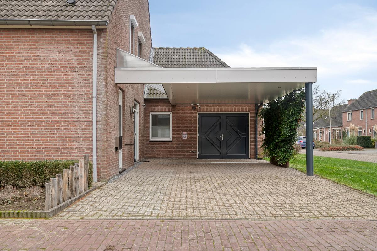 De voortuin is netjes aangelegd en ingericht met buxushagen en diverse beplanting. Aan de zijkant van de woning bevindt zich een carport (geplaatst in 2019) met toegang tot de garage, waardoor parkeren op eigen terrein mogelijk is. Er is plek voor twee auto's naast elkaar. De carport biedt beschutting tegen weer en wind en zorgt voor een comfortabele entree van de woning.