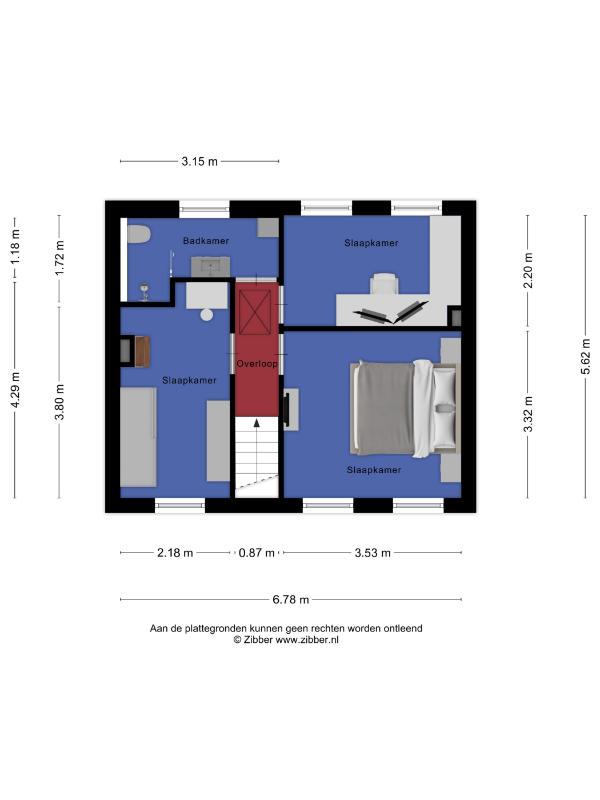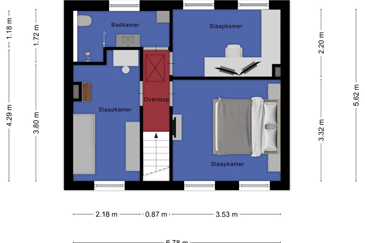 Eerste verdieping De overloop met PVC-vloer geeft toegang tot drie slaapkamers en de badkamer. De airco-unit op de overloop kan de gehele verdieping koelen of (bij)verwarmen.