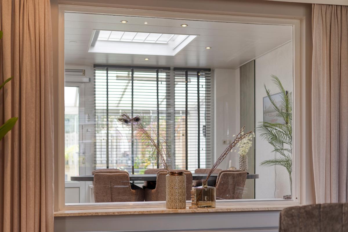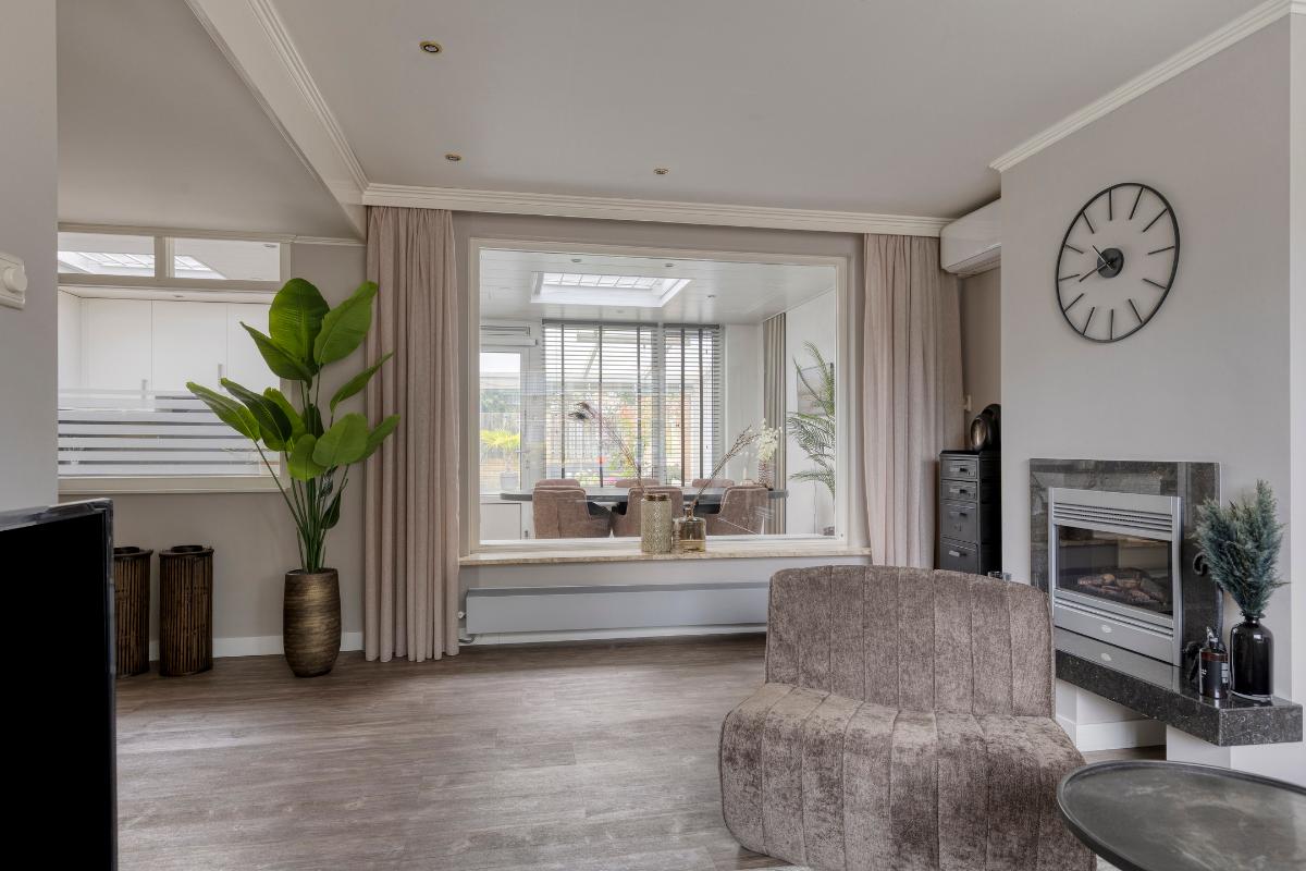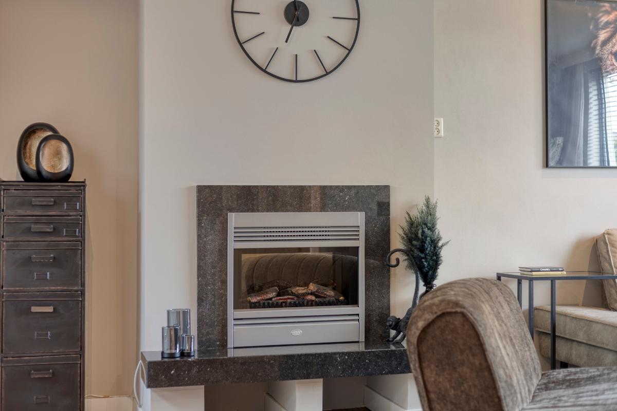 Woonkamer De L-vormige living is licht en ruim dankzij de grote raampartijen (met zonnescreen aan de voorzijde). De afwerking is strak met gestucte wanden, PVC-vloer en een spanplafond met inbouwspots. Een elektrische haard brengt extra sfeer in de donkere maanden. De airco-unit zorgt het hele jaar door voor een prettig binnenklimaat.