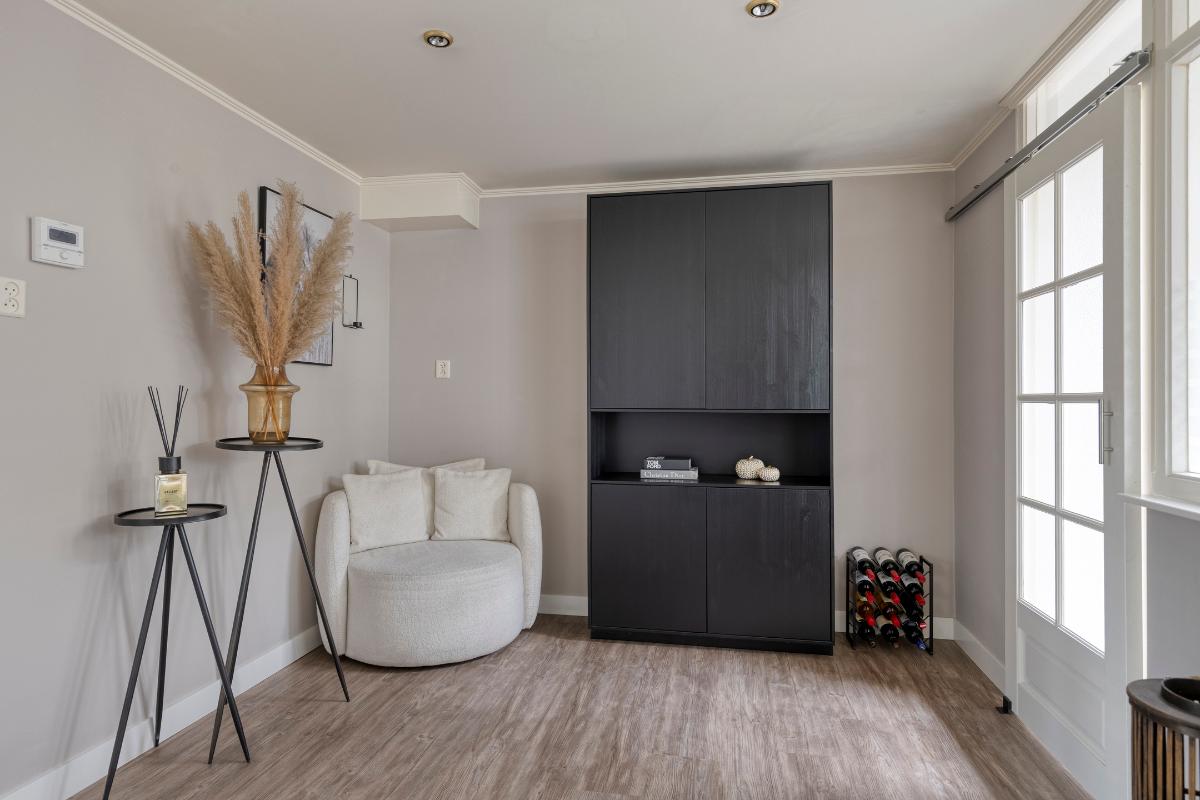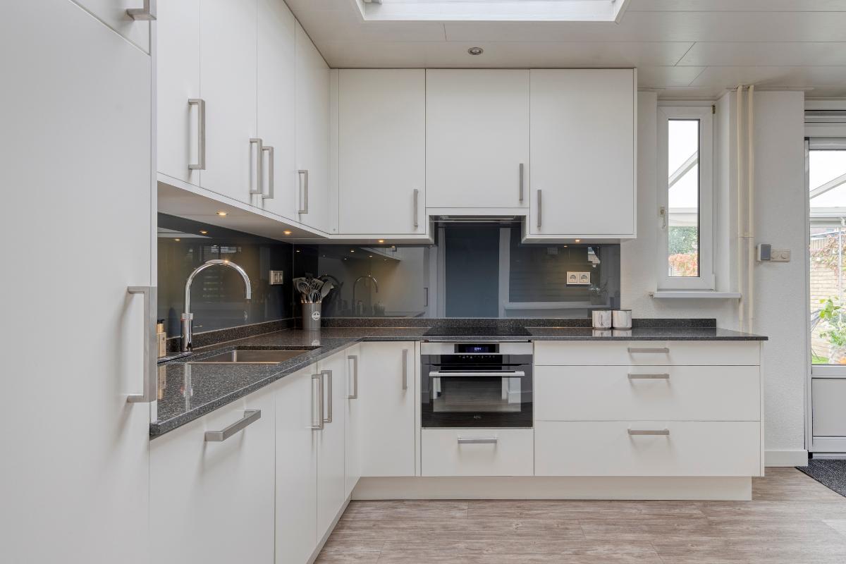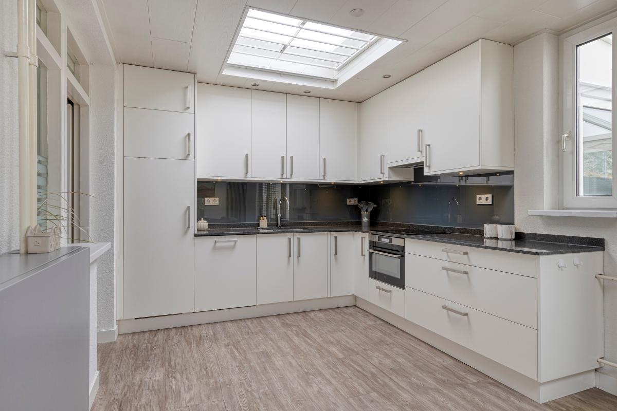 Leefkeuken (aanbouw) Aan de achterzijde ligt de royale leefkeuken: een heerlijke plek voor dagelijks koken en lang natafelen. Door de lichtkoepels valt het daglicht royaal binnen. Ook hier: PVC-vloer en wanden in spachtelputz. De keuken is compleet uitgerust met een granieten werkblad, inductiekookplaat, afzuigkap, vaatwasser, koelkast, combi-oven en Quooker voor direct kokend water. Veel kasten en lades bieden ruim voldoende bergruimte.