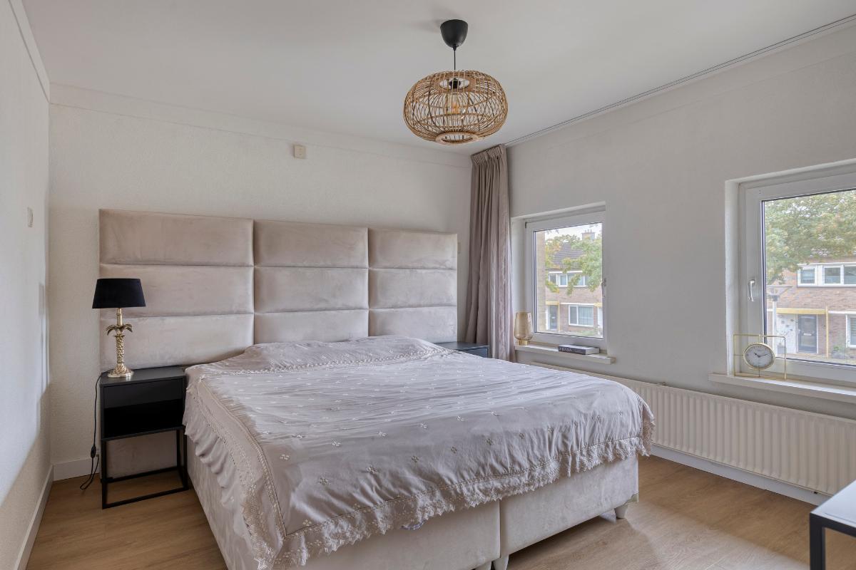 Slaapkamer 1 (voorzijde): ruim van opzet, PVC-vloer, kunststof kozijnen met dubbele beglazing en rolluiken.