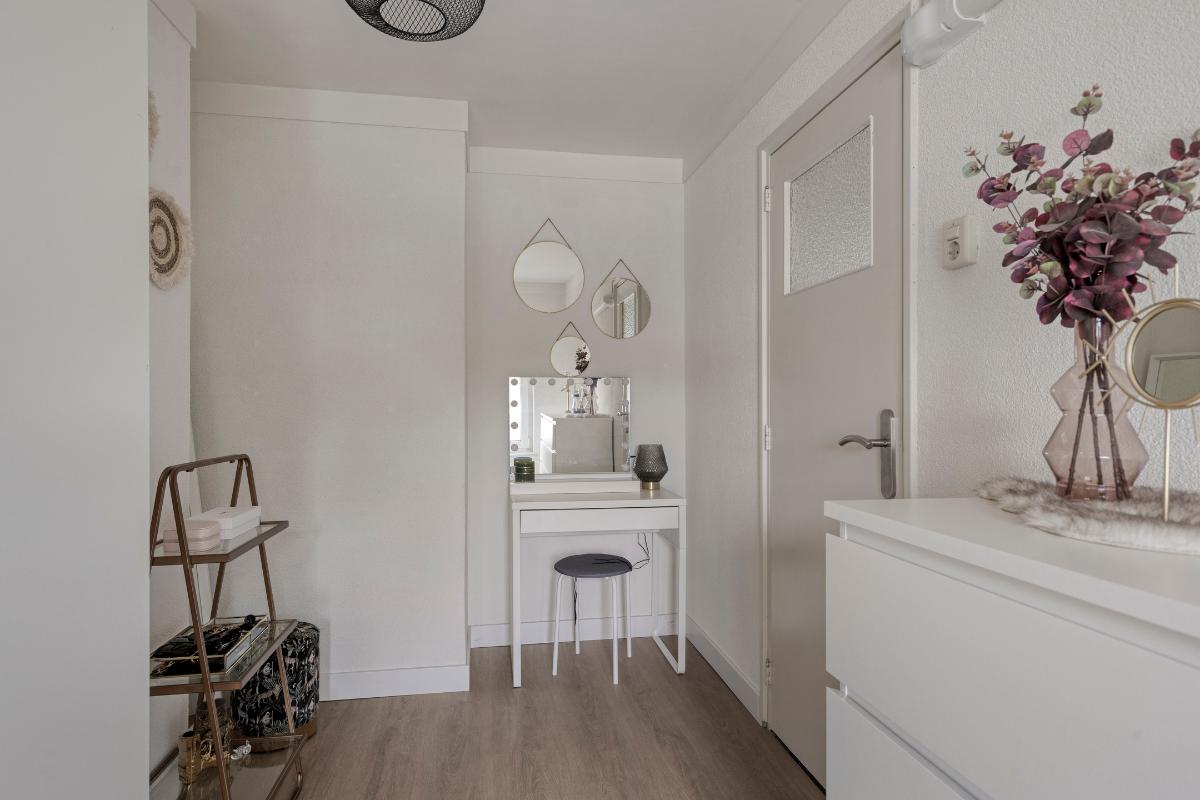 Via de verzorgde voortuin bereik je de overdekte entree. De hal met PVC-vloer biedt plaats aan garderobe, meterkast, een praktische trapkast en de toiletruimte.