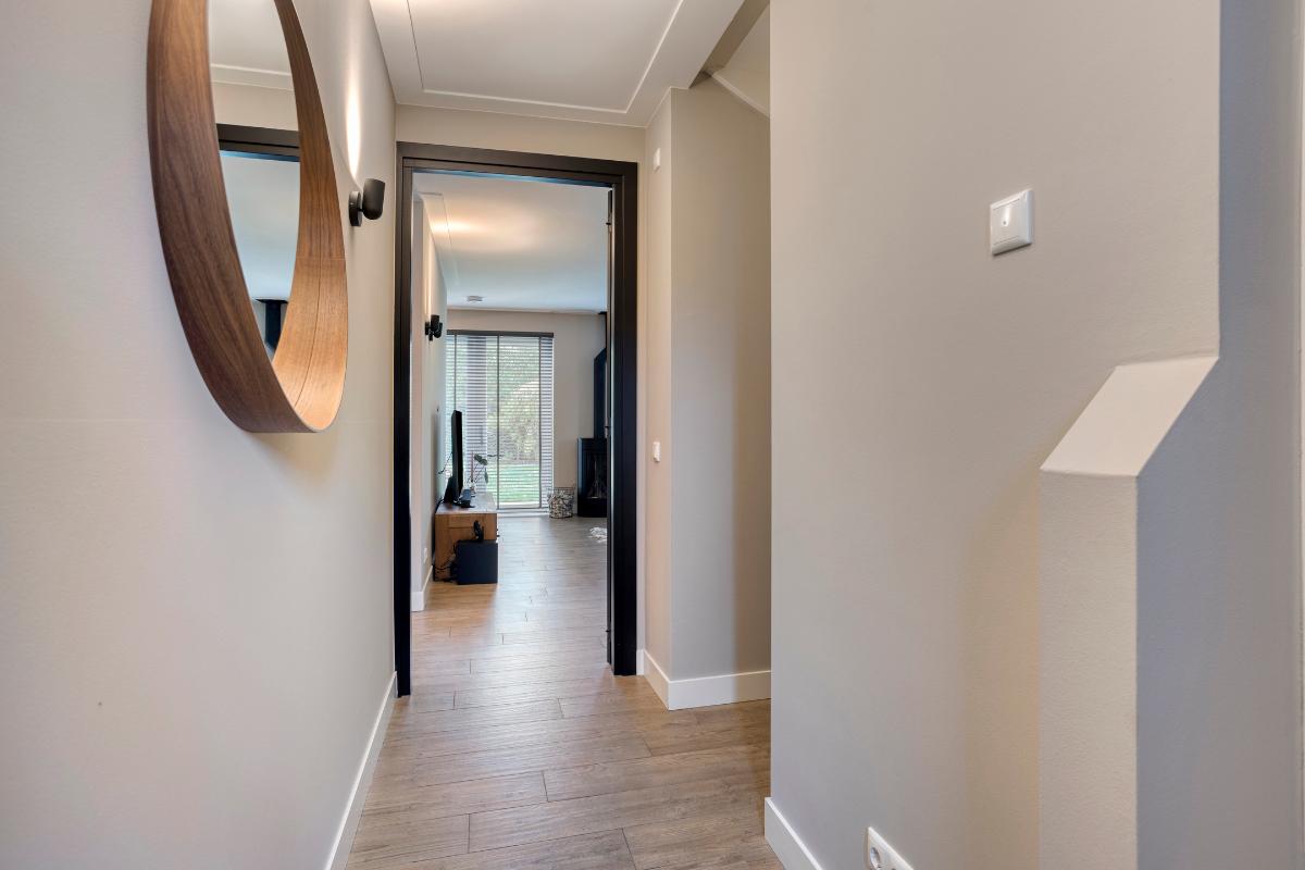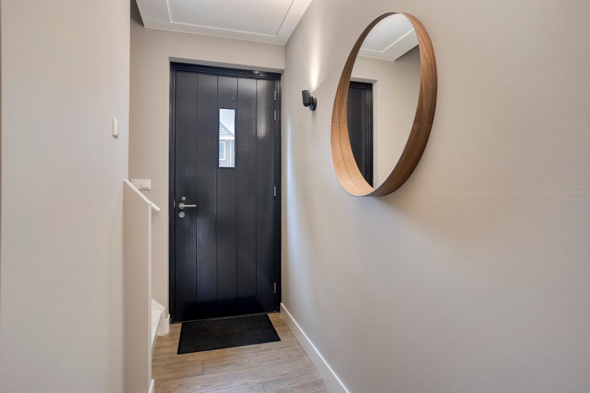 Entree De hal maakt direct een verzorgde indruk: ruim, licht en afgewerkt met een stijlvolle houtlook tegelvloer die naadloos doorloopt naar de woonkamer. Hier bevinden zich de garderobe, meterkast en de trapopgang naar de eerste verdieping. De hal vormt een prettige binnenkomst en geeft toegang tot de woonkamer.