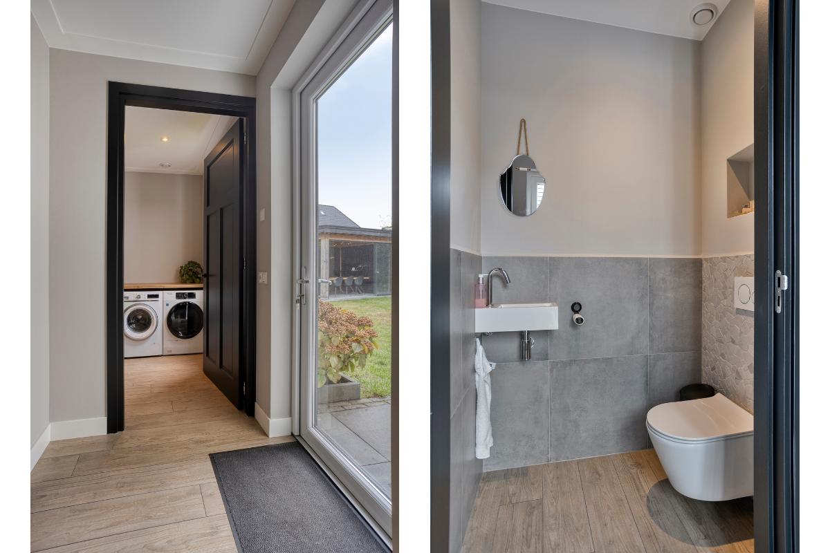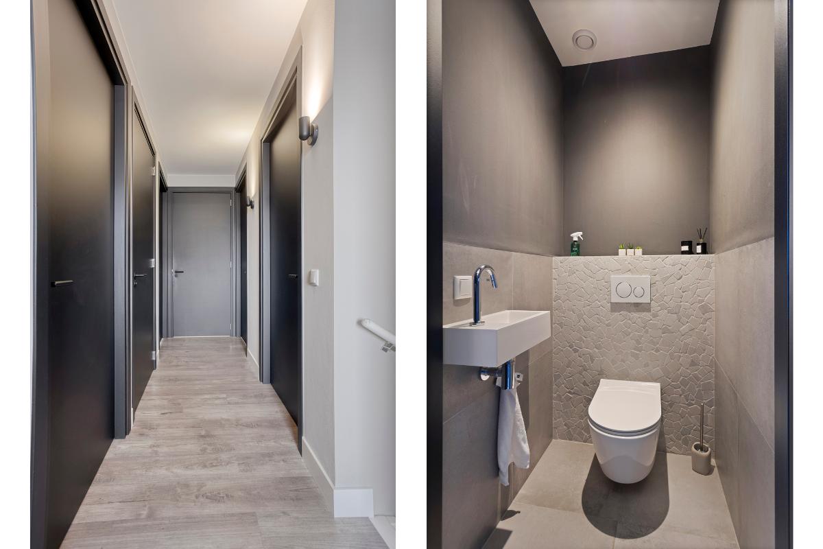 Toiletruimte De toiletruimte is afgewerkt in dezelfde stijl als de badkamer. De tegelvloer loopt door vanuit het portaal. De wanden zijn deels betegeld en zijn daarboven strak gestuukt. De ruimte is voorzien van een hangtoilet en fonteintje. De nis in de achterwand geeft de ruimte een speels effect.