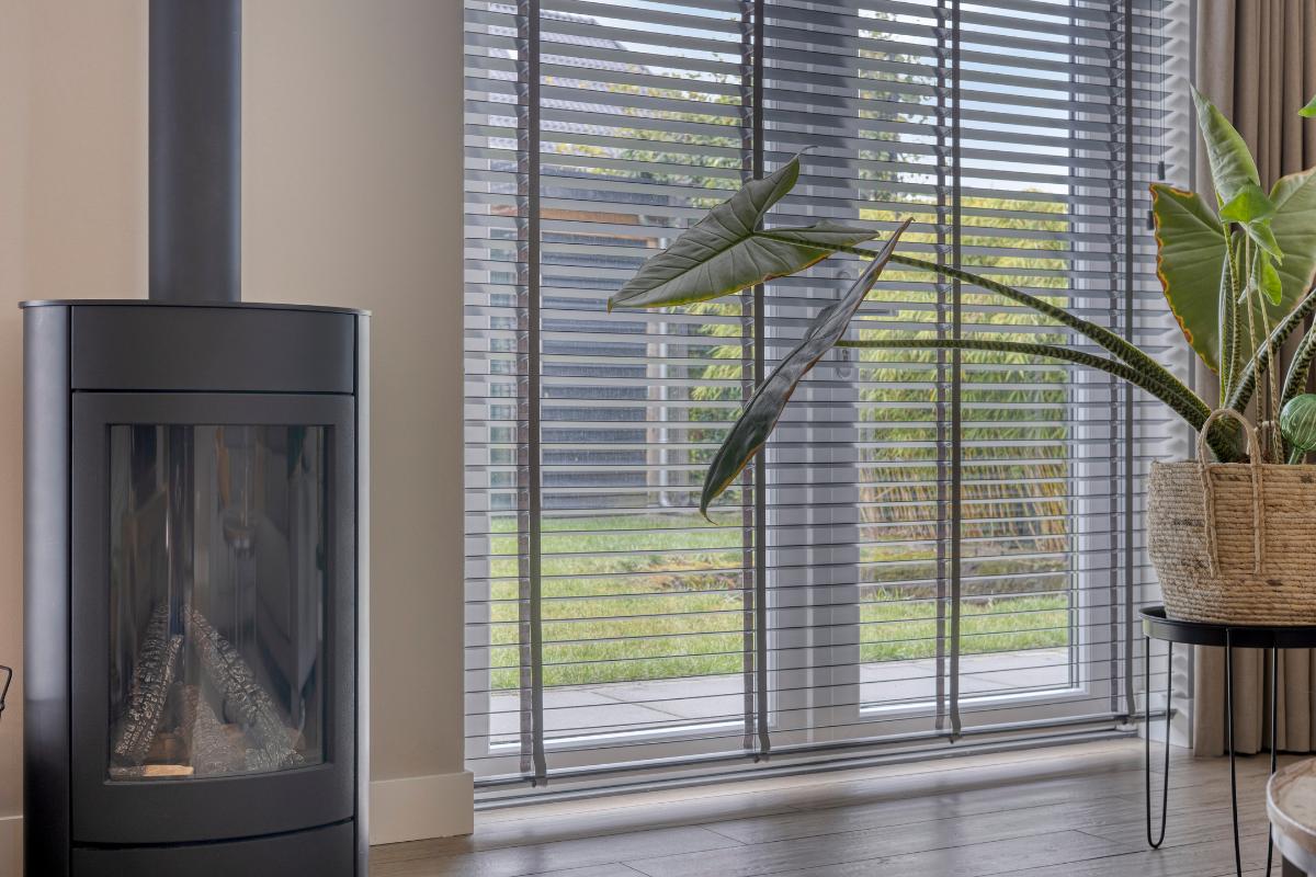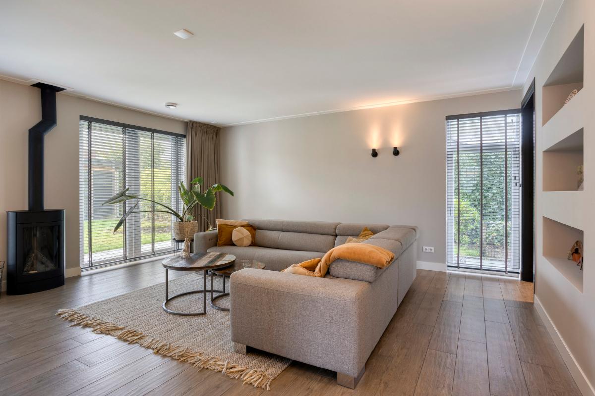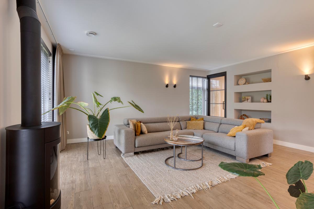 De zithoek aan de achterzijde vormt een warme en sfeervolle plek om te ontspannen. Een bijzonder detail zijn de ingebouwde decoratieve nissen in de wand van het zitgedeelte. Ze voegen niet alleen extra diepte toe aan de ruimte, maar bieden ook een sfeervolle plek voor boeken of accessoires. De moderne gashaard zorgt hier voor een aangenaam gevoel van comfort, maar is ook een stijlvolle eyecatcher die het interieur karakter geeft. De combinatie van het vele daglicht, de strakke afwerking en de tegelvloer in houtlook zorgt voor een aangename, luxe uitstraling.