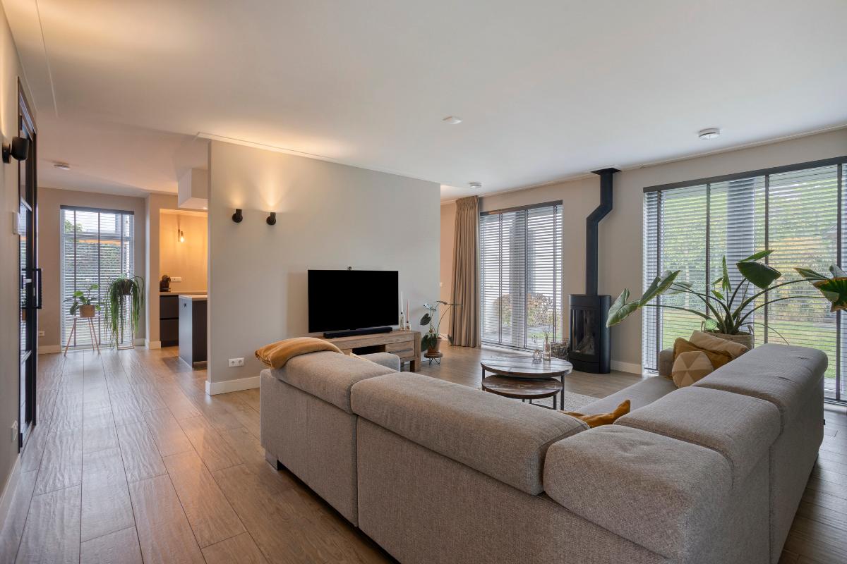 Woonkamer De woonkamer is een uitnodigende leefruimte met veel licht, ruimte en sfeer. Dankzij de grote ramen aan zowel de voor- als achterzijde is het hier op elk moment van de dag heerlijk licht. Aan de tuinzijde zorgen de dubbele openslaande deuren voor een directe verbinding met de tuin, waardoor binnen en buiten naadloos in elkaar overlopen. De ruimte is royaal opgezet met een duidelijke scheiding tussen het zit- en eetgedeelte, maar blijft toch één geheel dankzij de doorlopende vloer en rustige kleurstelling.