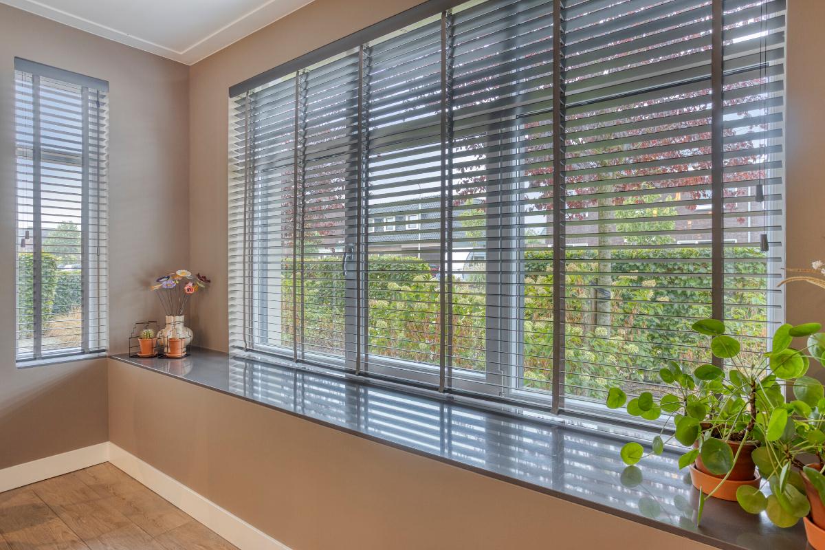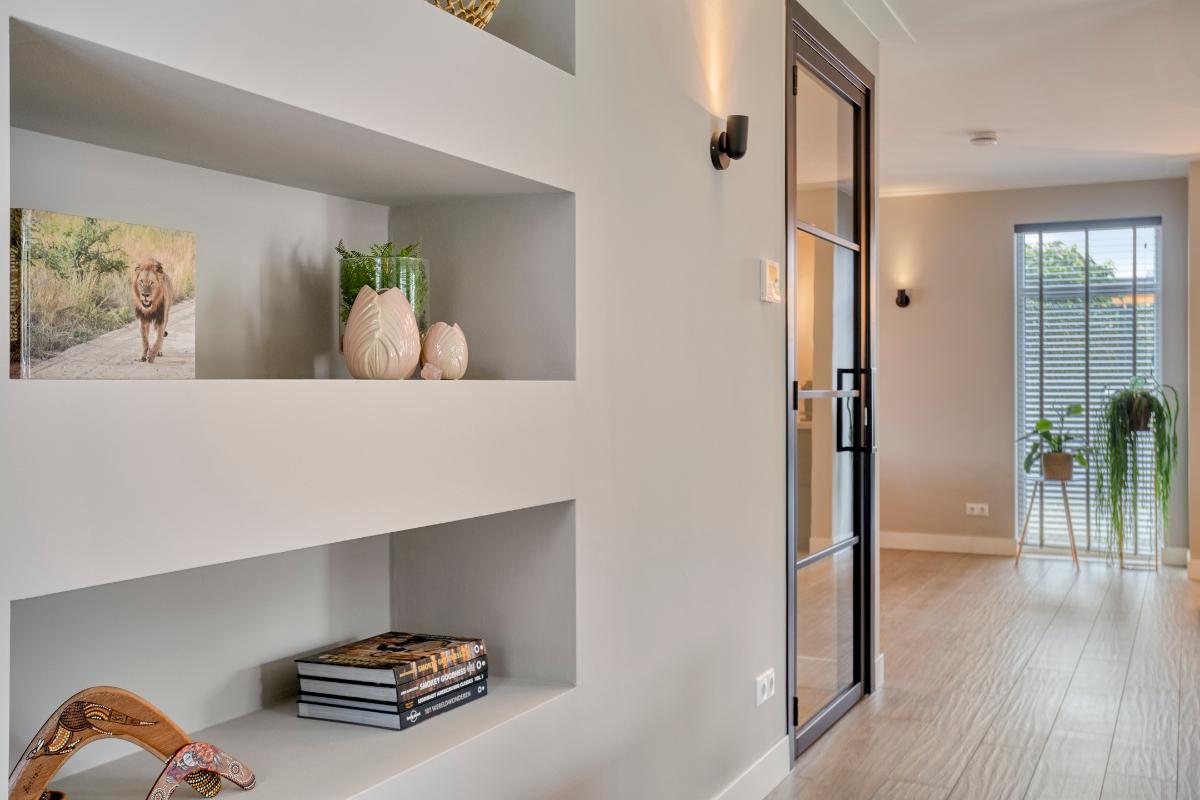 De verschillende ruimtes op de begane grond zijn met elkaar verbonden door glazen deuren met een strak zwart frame. Deze vormen een stijlvol geheel binnen het interieur en zorgen voor een open en lichte uitstraling. Alle wanden zijn voorzien van strak stucwerk. Ook de plafonds zijn strak gestuct en afgewerkt met een platte sierlijst.