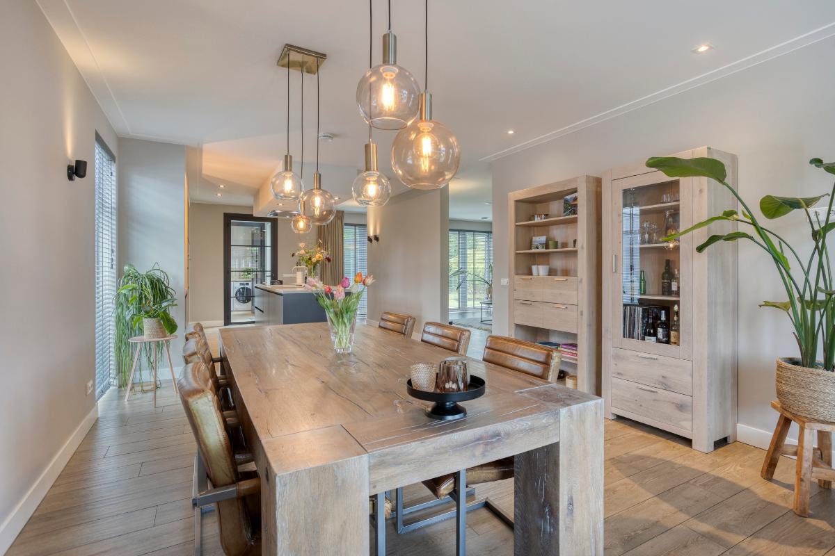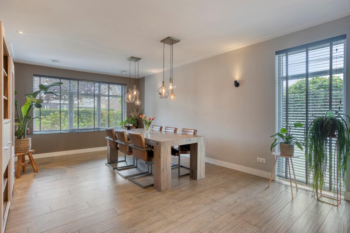 Aan de straatzijde is de ruime eethoek gesitueerd, met voldoende plek voor een grote tafel — de ideale plek voor gezellige diners of lange avonden met familie en vrienden.