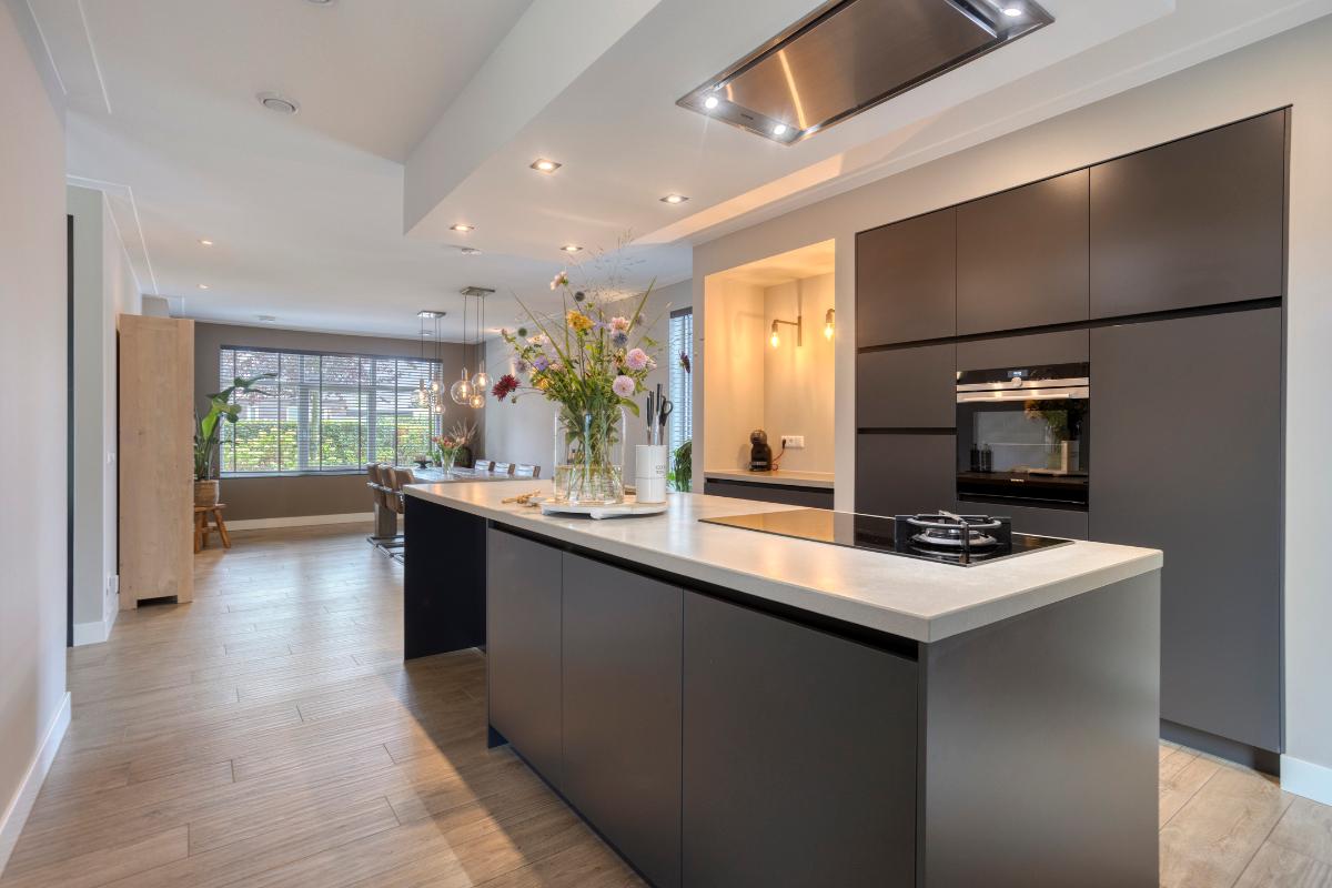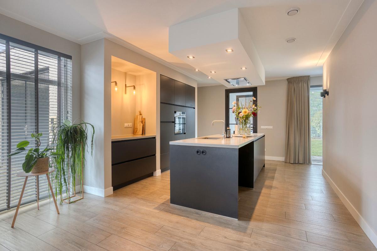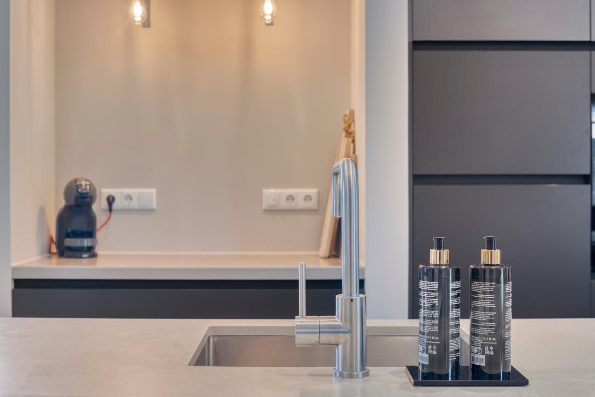 Keuken De open keuken sluit perfect aan op de woonkamer en vormt het hart van het huis. De opstelling is modern en strak. De keukeninrichting bestaat uit een kookeiland, kastenwand en aparte koffiehoek. De zwarte fronten staan in mooi contrast met het composieten blad in een lichte tint. Alle apparatuur is netjes geïntegreerd, waaronder een inductiekookplaat, afzuigkap, combi stoomoven, koelkast, vriezer en vaatwasser (op hoogte). De close-in boiler zorgt voor het warme water in de keuken. De brede lades en hoge kasten zorgen voor praktische opbergruimte en een opgeruimd geheel. Het kookeiland biedt nog ruimte voor twee zitplekken. Een heerlijke plek voor een snel ontbijt of borrel tijdens het koken.