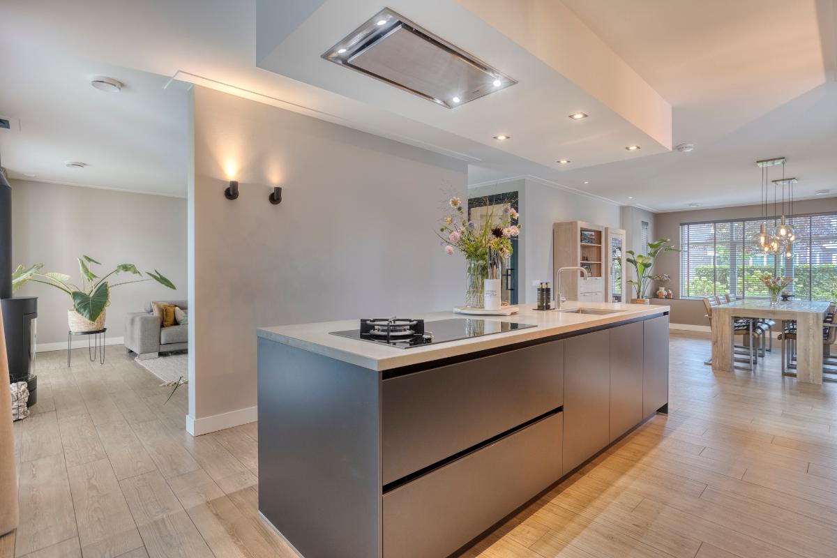In de keuken en het eetgedeelte is het plafond voorzien van inbouwspots. Door de open indeling en het vele glas geniet ook dit gedeelte van de begane grond een prachtige lichtinval.