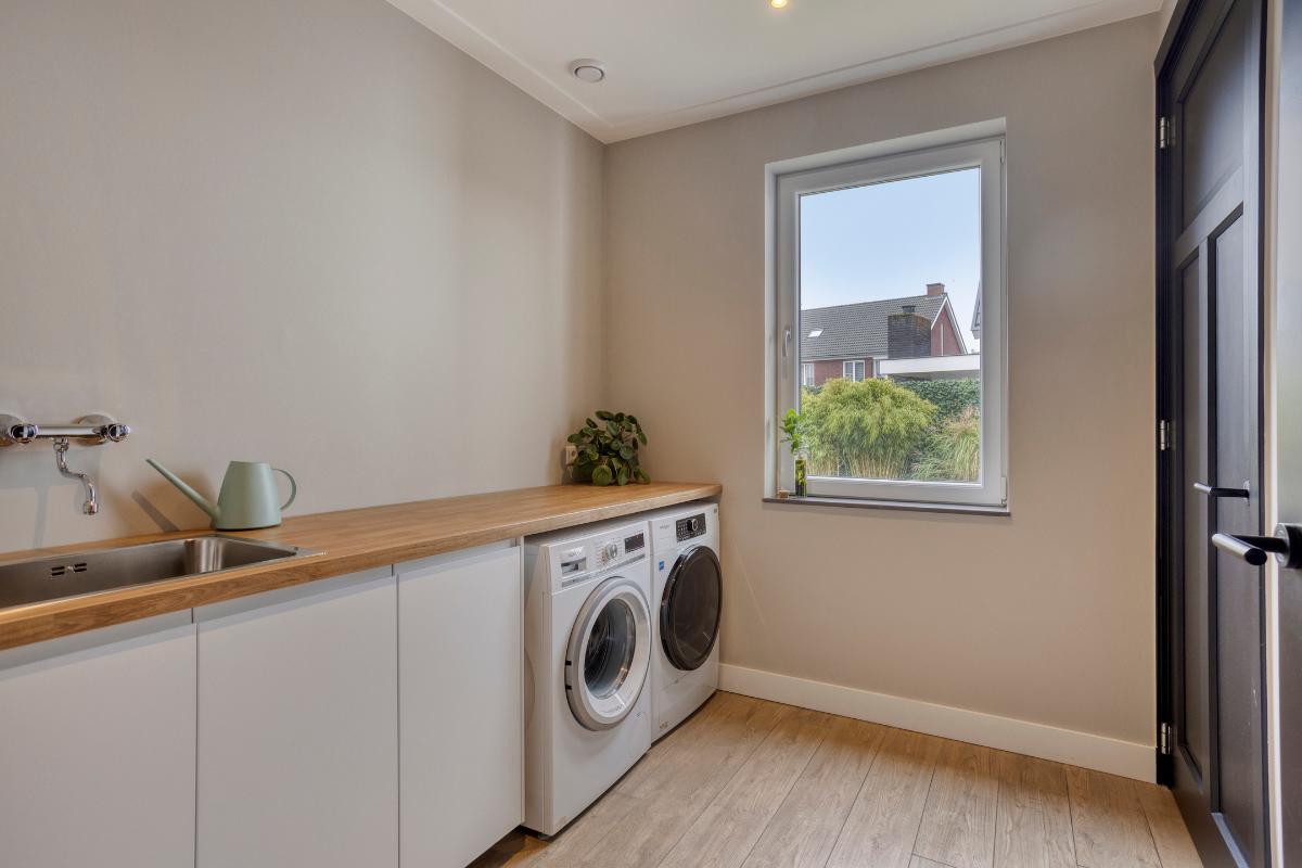 Bijkeuken Vanuit het portaal is de praktische bijkeuken bereikbaar. Ingericht met een werkblad met onderkasten en een spoelbak. Hier bevinden zich de aansluitingen voor de wasapparatuur.
