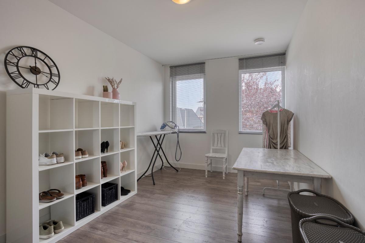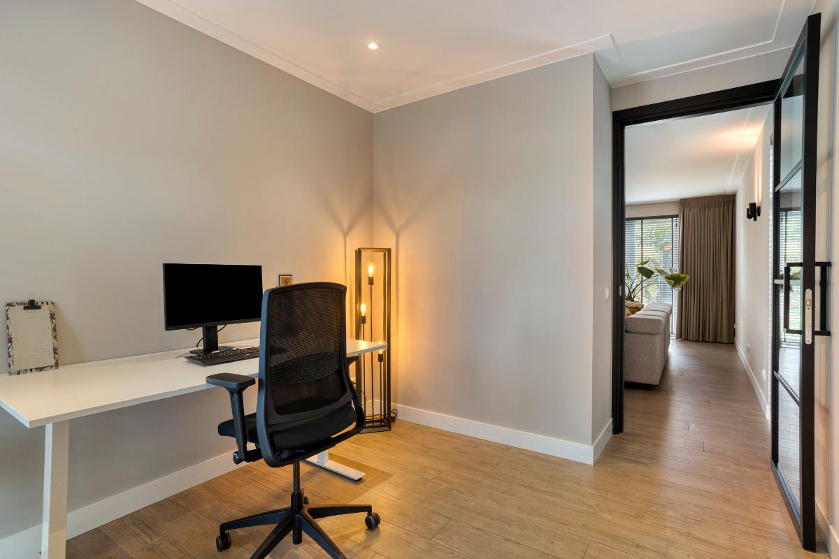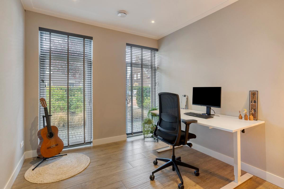 Extra kamer begane grond voorzijde Vanuit de zithoek is de extra kamer op de begane grond, aan de voorzijde van de woning, bereikbaar. De kamer is licht en netjes afgewerkt en kijkt uit over de rustige straatzijde. Dankzij de ligging aan de voorkant van de woning is dit een fijne, afgezonderde plek om te werken of te studeren. Of juist ideaal als speelkamer voor de kinderen, omdat je dankzij de glazen deur altijd zicht houdt op de ruimte.