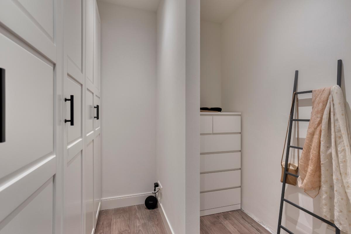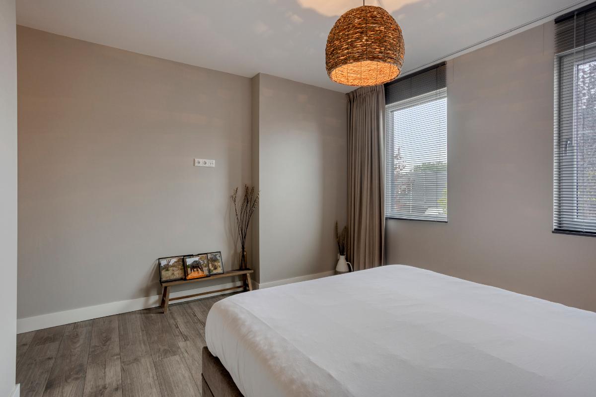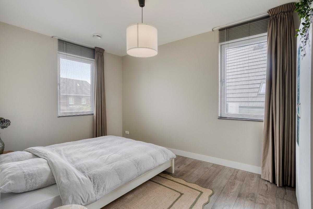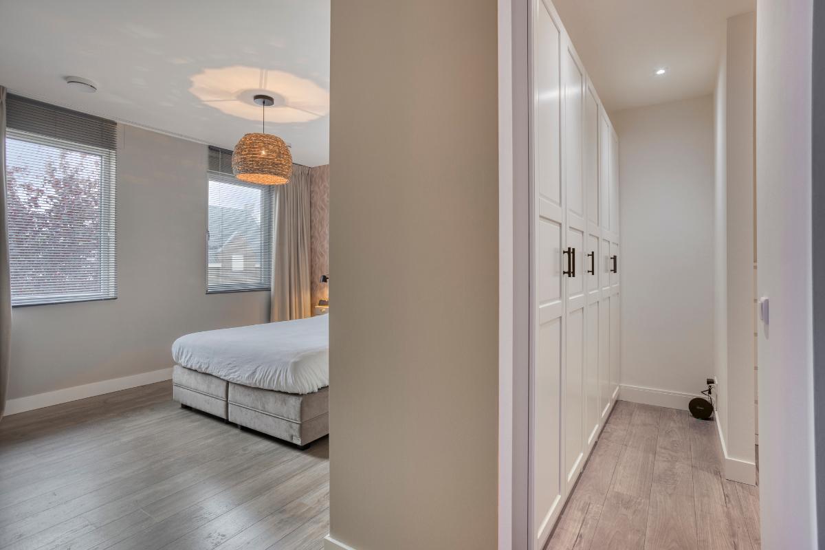 Slaapkamer 1 met inloopkast De hoofdslaapkamer ligt aan de voorzijde van de woning en is een comfortabele en sfeervolle ruimte met aangrenzende inloopkast. De kamer biedt voldoende ruimte voor een groot bed en beschikt over twee grote ramen voor een prettige lichtinval. De inloopkast is een luxe toevoeging. In de aangrenzende ruimte zijn al voorbereidingen getroffen voor het realiseren van een tweede badkamer met douche en wastafel.