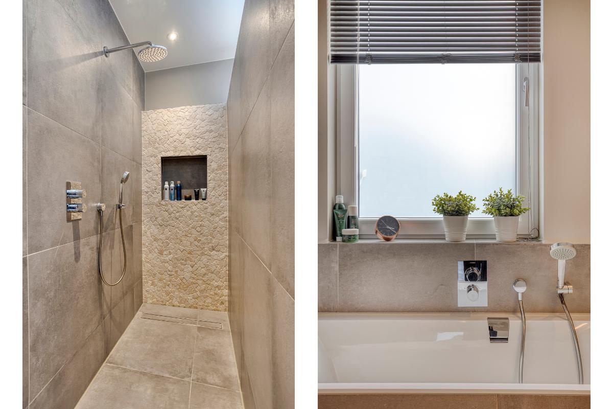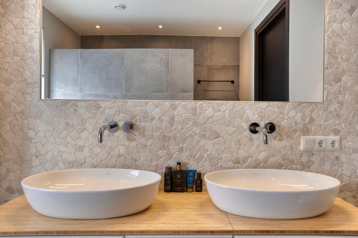 De afwerking is van hoog niveau. De combinatie van warme, natuurlijke tinten en luxe materialen zorgt voor een echte wellnesssfeer. De achterwand van het wastafelmeubel en de wand in de douche springen in het oog door de unieke mozaïektegel, die de ruimte een subtiele, chique uitstraling geeft. Strakke inbouwkranen, een moderne tegelvloer met vloerverwarming, plafondspots en een raam dat geopend kan worden voor natuurlijke ventilatie maken het geheel niet alleen stijlvol, maar ook praktisch en comfortabel in gebruik.