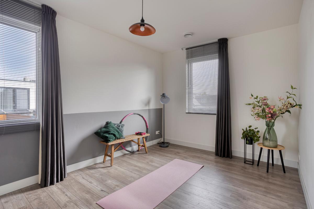 Slaapkamer 2 De tweede slaapkamer bevindt zich aan de achterzijde van de woning en is eveneens royaal van formaat: ca. 15m². Ook hier zorgen de grote ramen voor veel daglicht en een aangename sfeer. Deze ruimte is nu in gebruik als sportkamer maar qua ruimte meer dan ruim genoeg voor kinderkamer of logeerkamer.