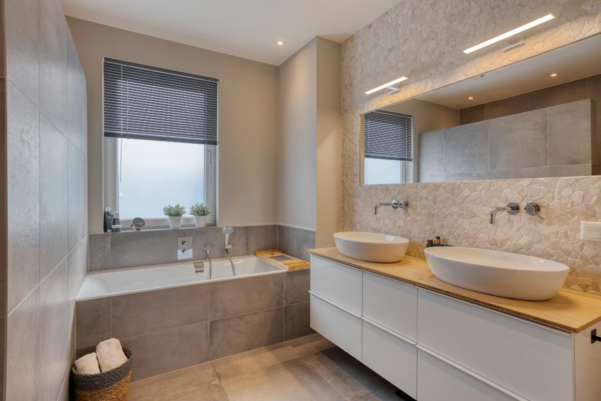 Badkamer Centraal op de eerste verdieping, tussen slaapkamer 2 en 3, bevindt zich de stijlvolle badkamer – een ruimte die direct rust en luxe uitstraalt. De inrichting is eigentijds en compleet: een comfortabel ligbad, ruime inloopdouche, dubbele wastafel met breed meubel en een grote spiegel die de ruimte extra licht en diepte geeft.
