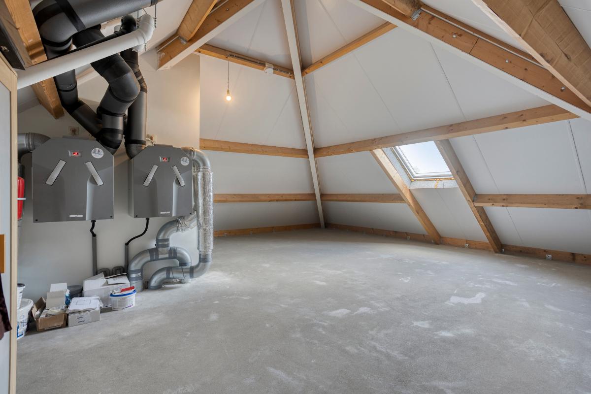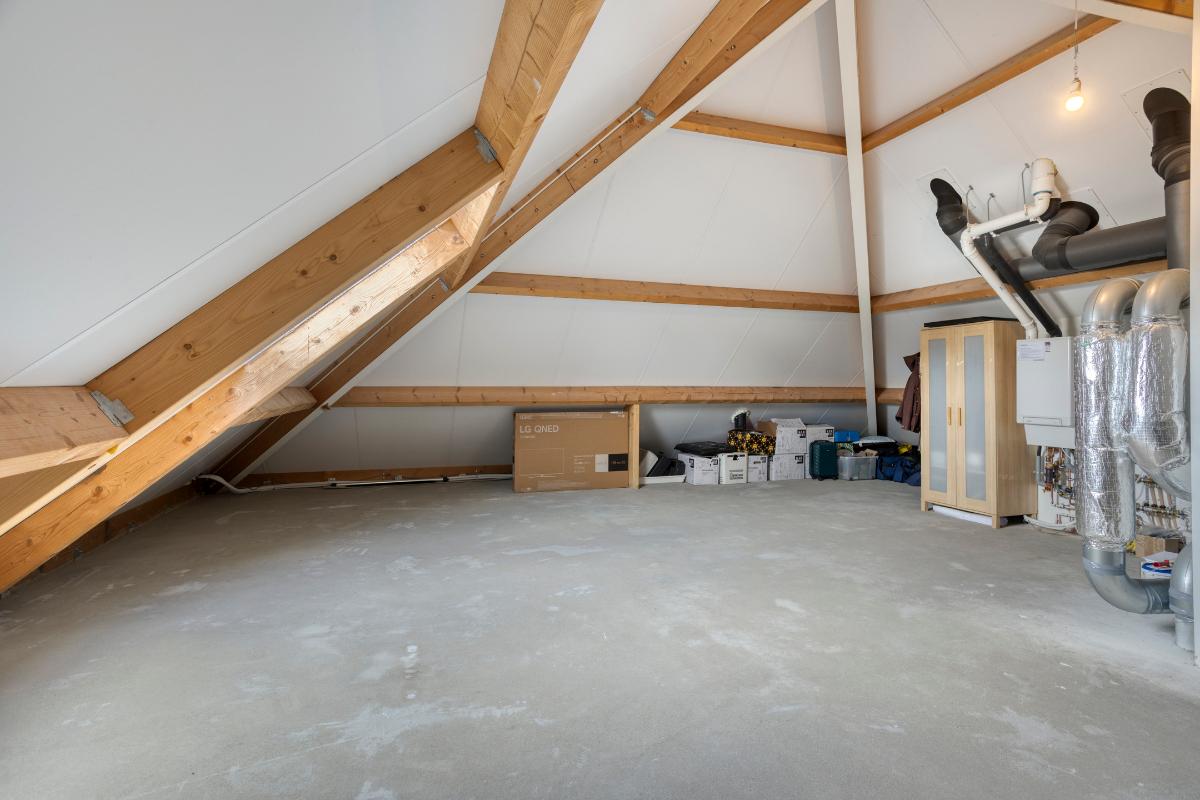 Via een vaste trap bereik je de ruime zolderverdieping. Deze is nog niet ingericht als woonruimte, maar in gebruik voor het opbergen van diverse spullen. Het is echter een multifunctionele ruimte met een hoge nok en volop daglicht. De vloer kan nog naar wens afgewerkt worden, maar verder is de zolder in keurige staat. Met beperkte investering kunnen hier een of meerder extra slaapkamers gerealiseerd worden. Op de zolder bevinden zich tevens de technische installaties, waaronder de CV-ketel en het WTW-systeem. Een ruimte met mogelijkheden!