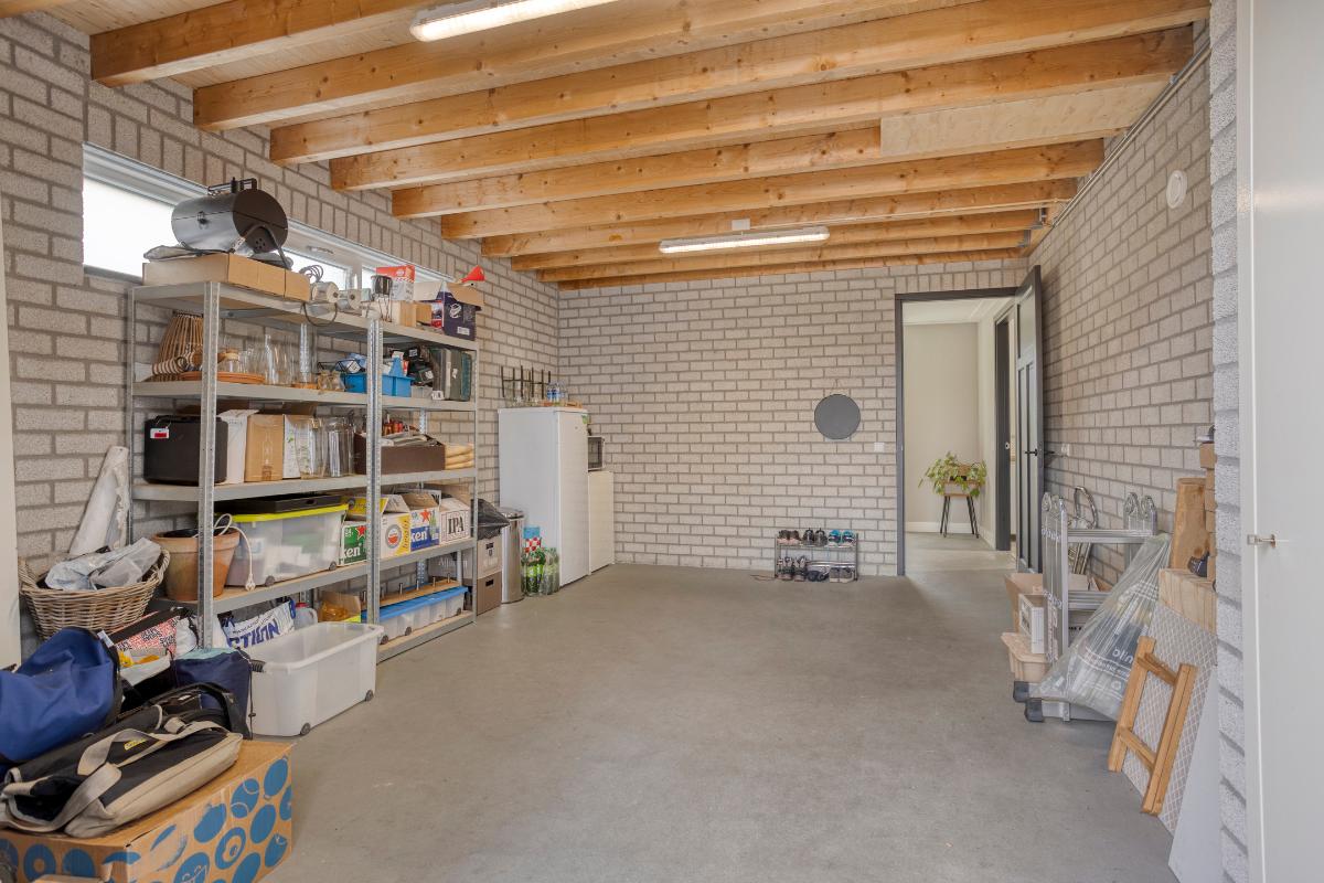 Garage Aangrenzend bevindt zich de ruime garage met dubbele houten deuren naar de oprit. Een nette, goed onderhouden ruimte, voorzien van elektra, met voldoende plek voor auto, fietsen of hobbyspullen.