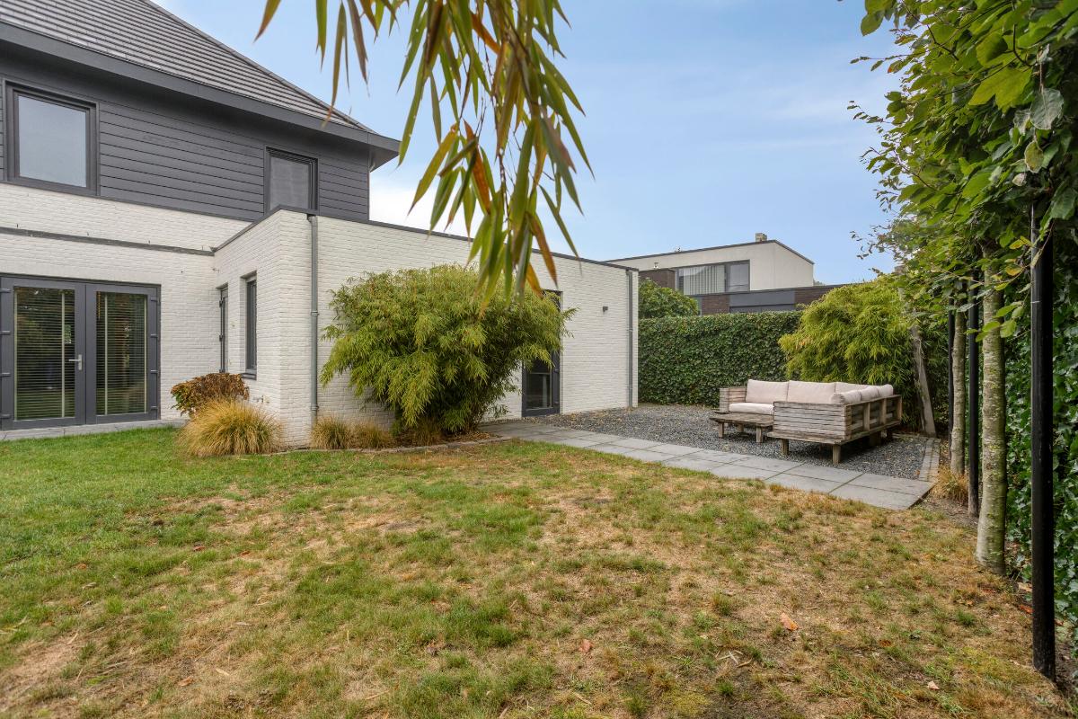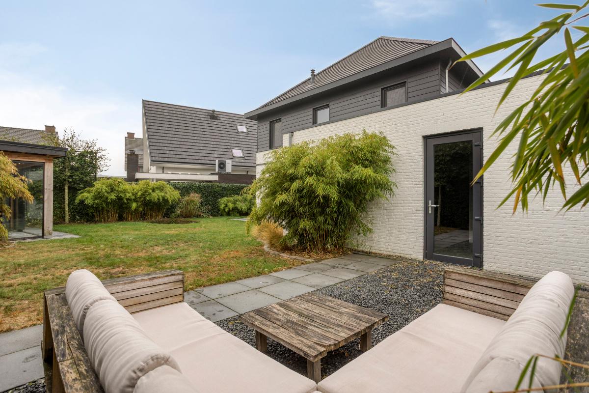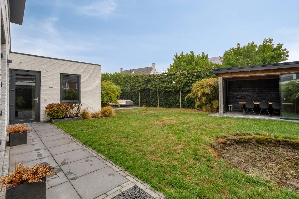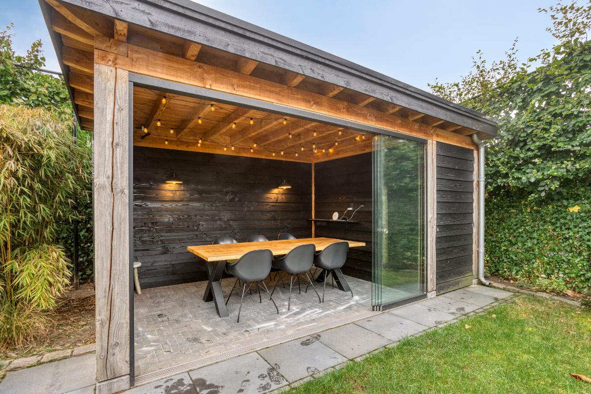 Blikvanger in de tuin is de houten overkapping met glazen schuifwanden. Een heerlijke plek op zowel warme dagen als de wat frissere momenten. Aangrenzend bevindt zich nog een tuinberging, perfect voor het opbergen van tuinspullen.