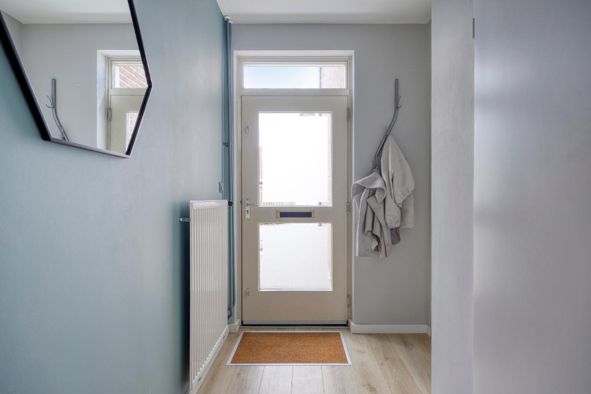 Hal De hal vormt een verzorgde en lichte ontvangst van de woning. Dankzij de glasvlakken in de voordeur valt prettig daglicht binnen, wat direct zorgt voor een open en uitnodigende sfeer. De ruimte is afgewerkt met een lichte laminaatvloer in houtlook, strakke wandafwerking en rustige kleurstellingen. Er is voldoende ruimte voor een garderobe.
