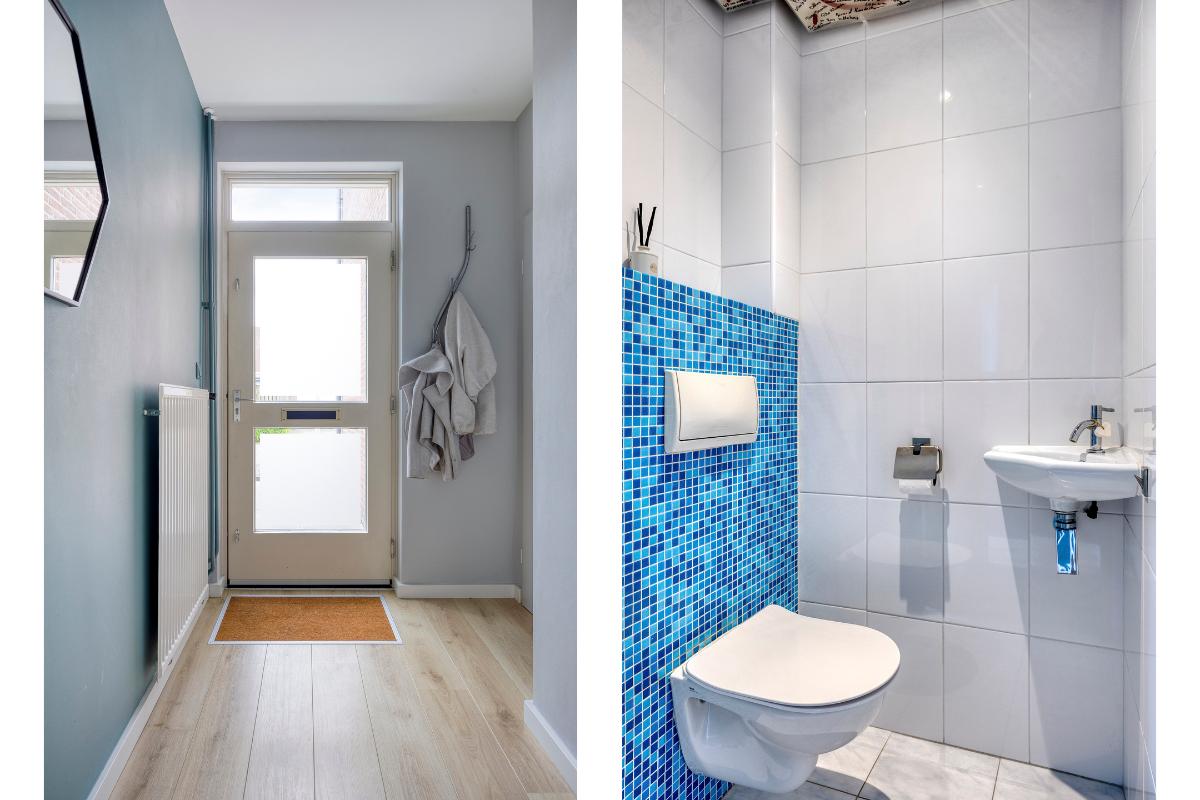 Toiletruimte De toiletruimte is verzorgd afgewerkt. De combinatie van lichte wandtegels met een speels blauw mozaïekaccent geeft de ruimte een frisse uitstraling. Er is een wandcloset en een fonteintje aanwezig.