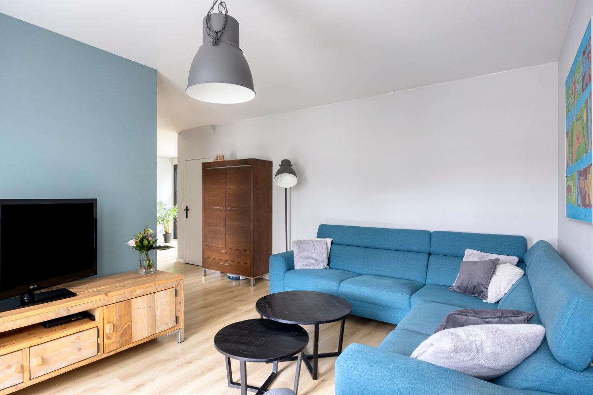 De woonkamer en keuken zijn voorzien van een lichte laminaatvloer in houtlook, strak gestucte wanden en rustige tinten die zorgen voor een moderne en verzorgde uitstraling.