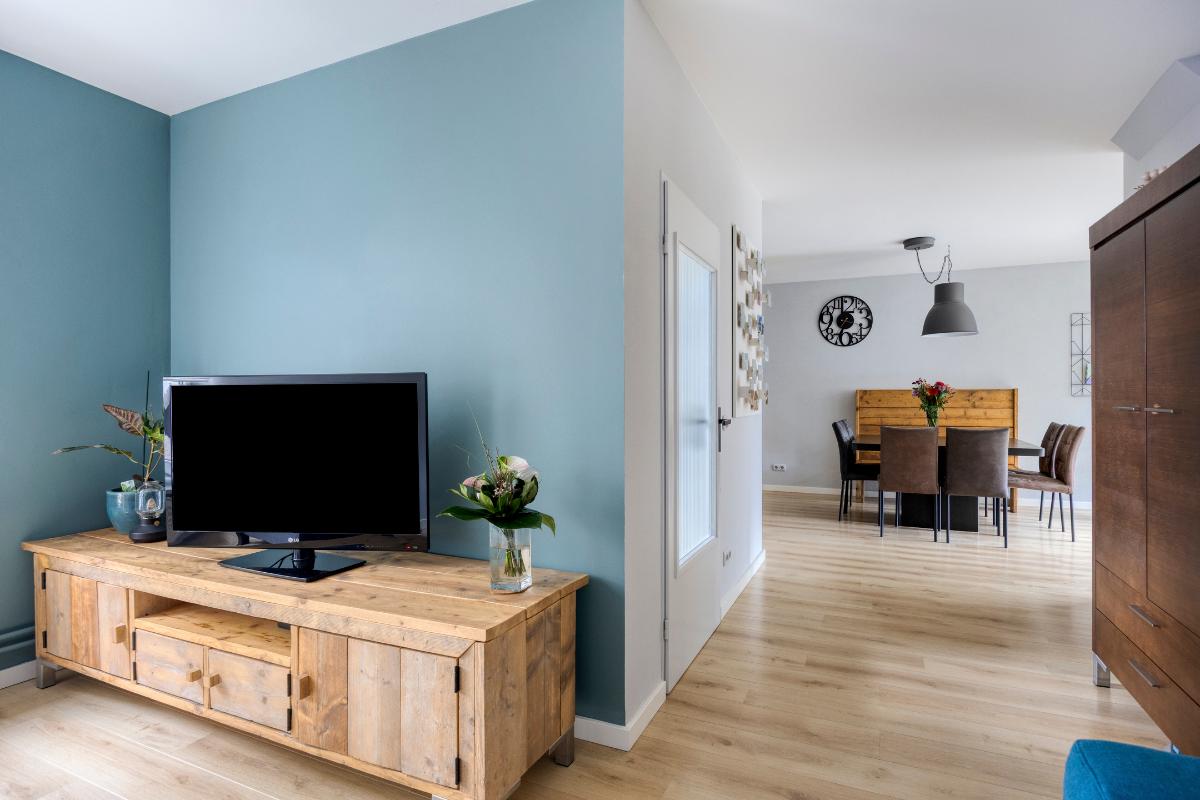 De warme vloerafwerking in houtlook, de strakke wandafwerking en de moderne maatwerkkasten geven de ruimte een verzorgde en eigentijdse uitstraling.