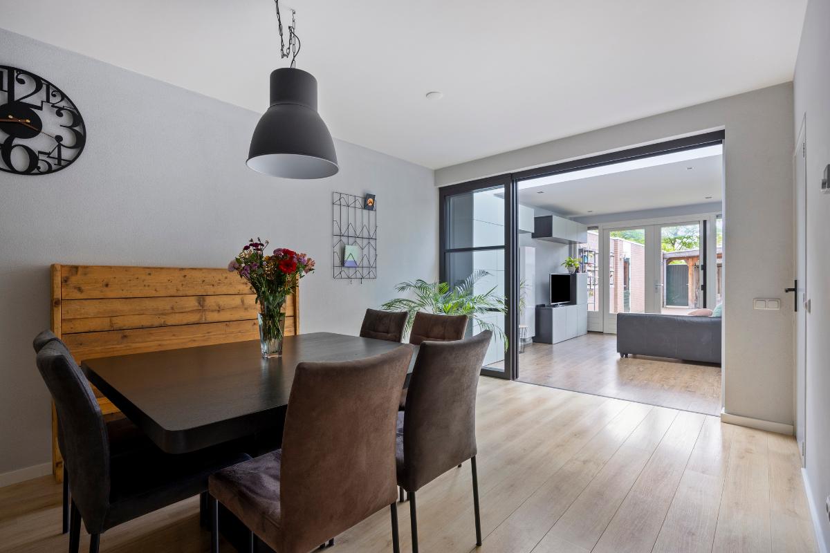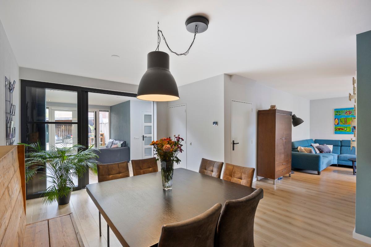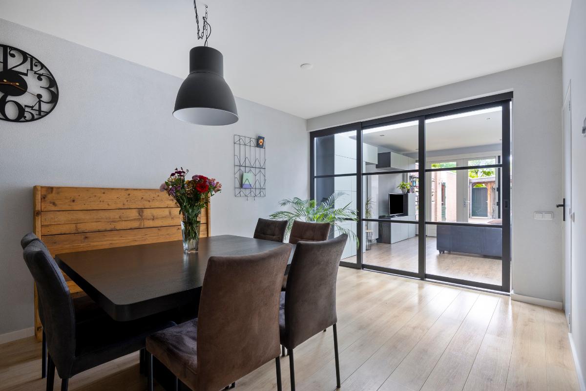 Dankzij de grote raampartijen en dubbele tuindeuren staat deze ruimte in directe verbinding met de achtertuin en valt er aangenaam veel daglicht binnen. De lichtstraat in het plafond versterkt dit effect en zorgt voor een bijzonder open en ruimtelijke beleving.