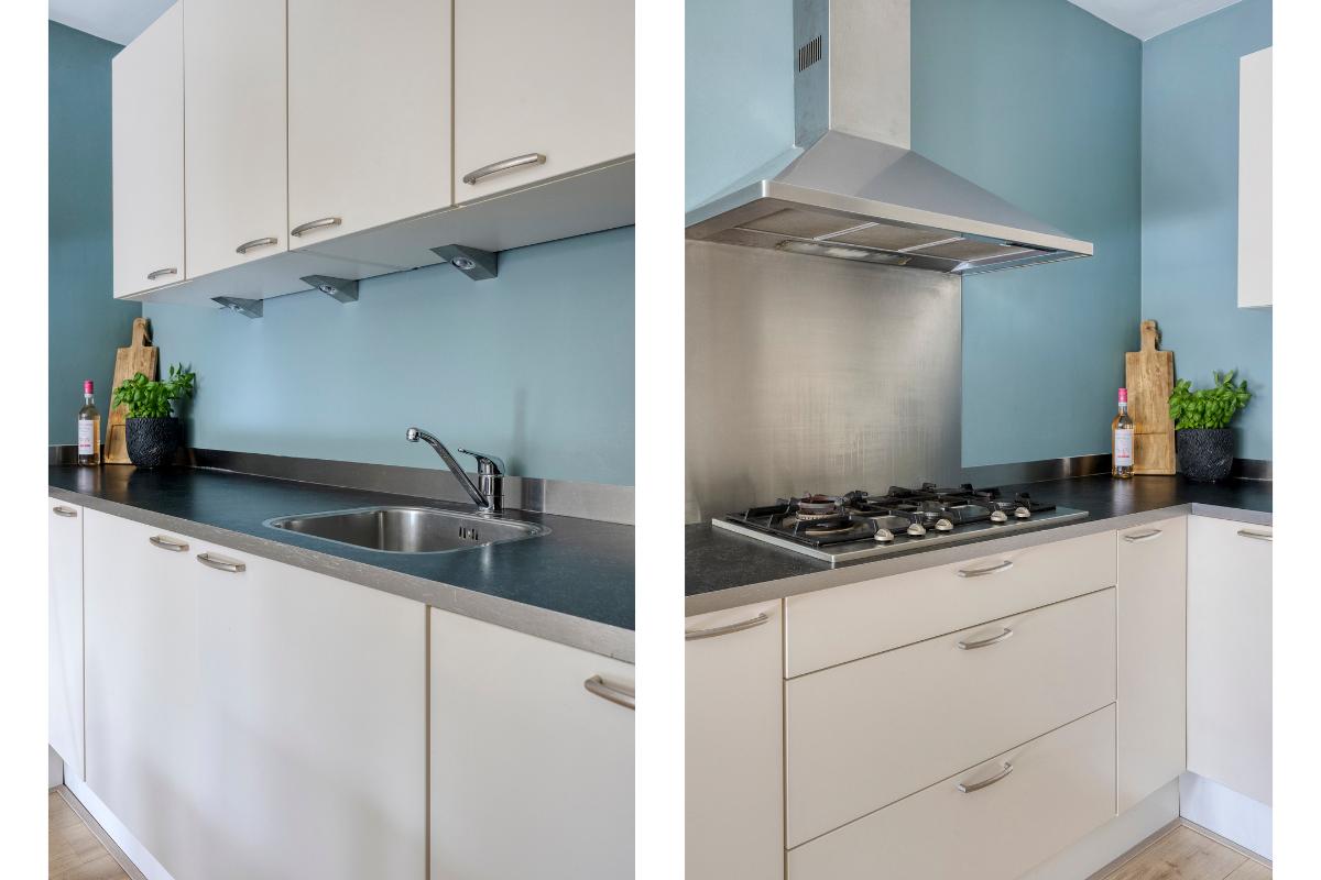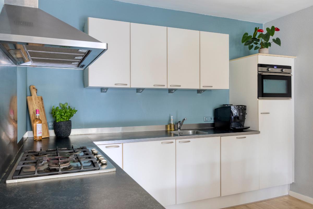 Qua apparatuur is de keuken compleet ingericht met een gaskookplaat met afzuigkap, combi-magnetron (2024), spoelbak met mengkraan, koelkast (2025) en vaatwasser (2018).