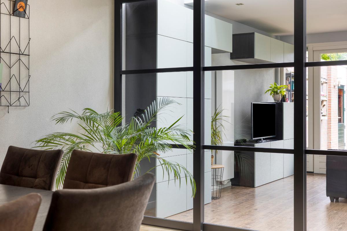 Dit gedeelte van de woonkamer wordt door de stijlvolle glazen schuifwand in een zwart houten frame gescheiden van de aanbouw waar zich een apart woongedeelte bevindt.