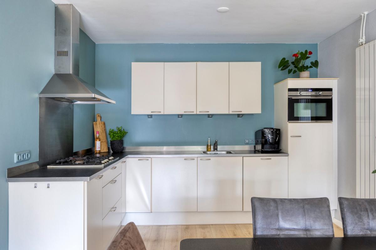 De keuken heeft een moderne uitstraling dankzij de lichte fronten in combinatie met een donker werkblad en subtiele RVS-accenten. De frisse kleurstelling van de achterwand geeft het geheel een eigentijds en sfeervol karakter.