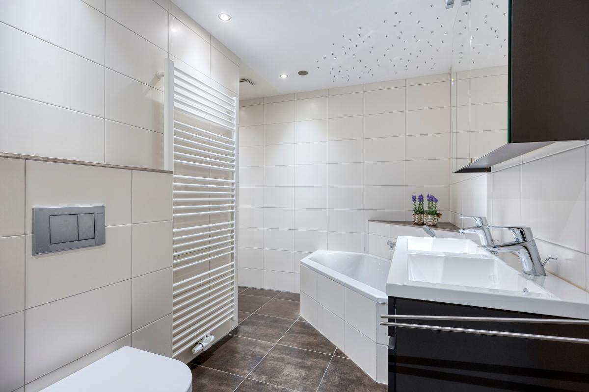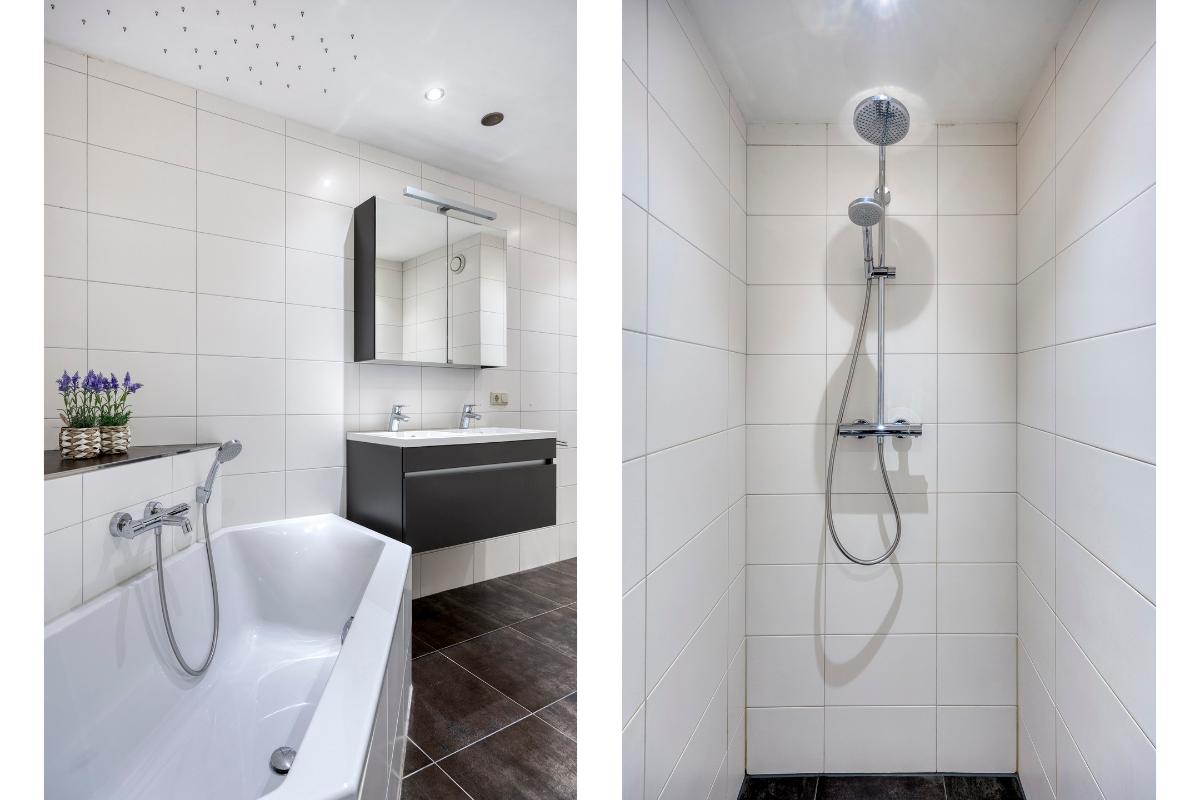 Aan comfort ontbreekt het hier niet: de badkamer beschikt over een groot hoekligbad, een separate inloopdouche met regendouche en handdouche, een dubbele wastafel met fraai meubel en een grote spiegelkast met extra bergruimte. Het wandcloset en de designradiator completeren het geheel.