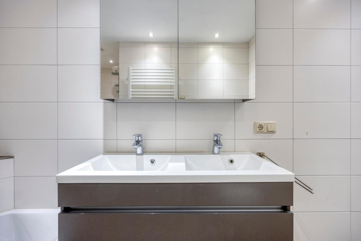 Badkamer De badkamer is uitgevoerd in een tijdloze en verzorgde stijl met een moderne combinatie van lichte wandtegels en donkere vloertegels. De ruimte oogt fris, ruim en praktisch ingedeeld.
