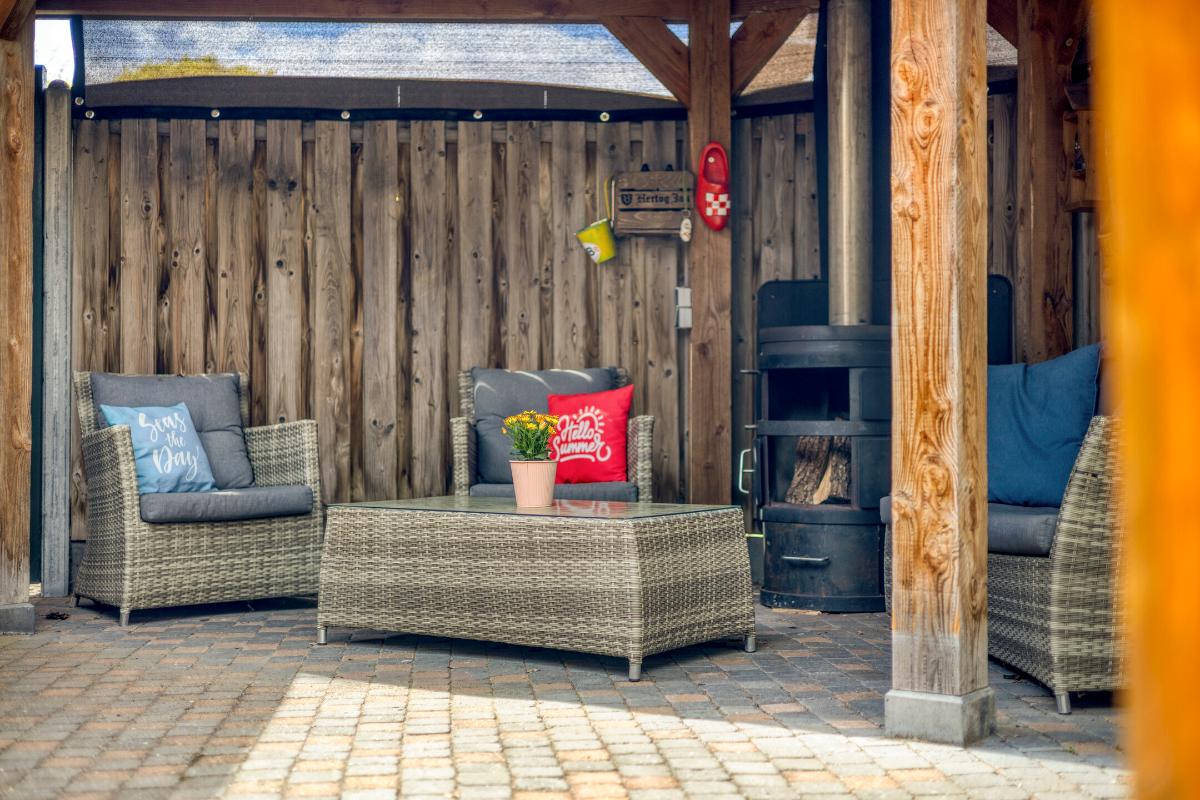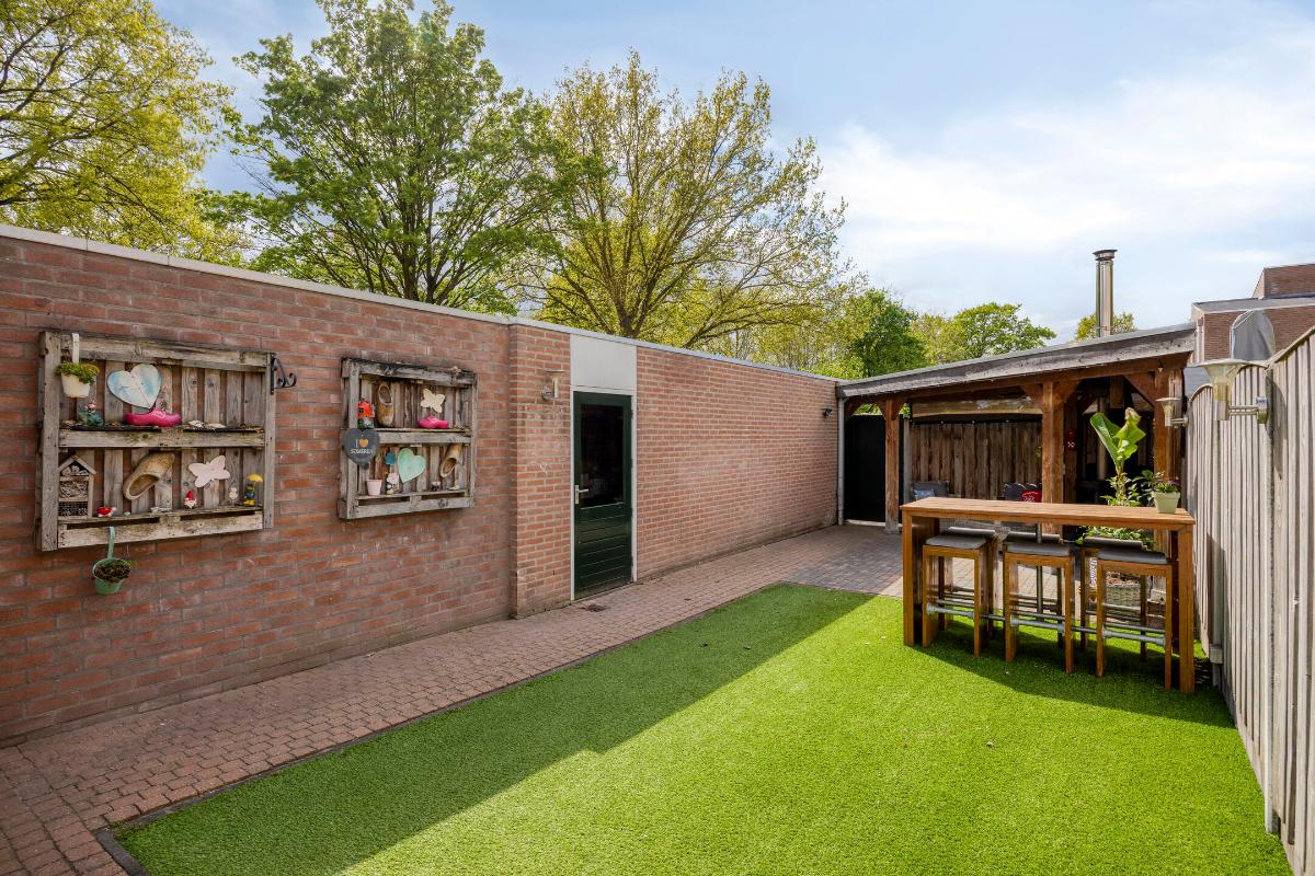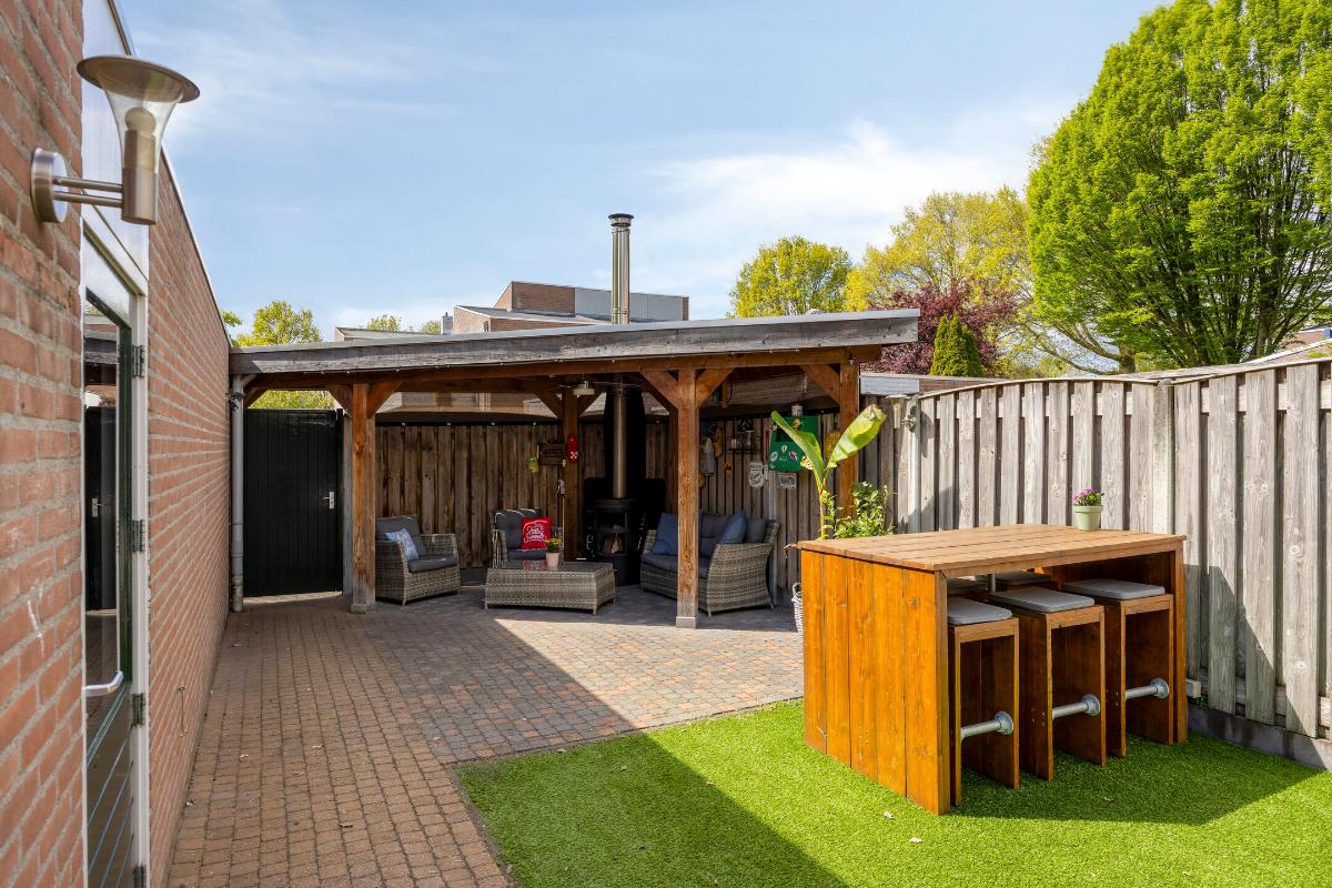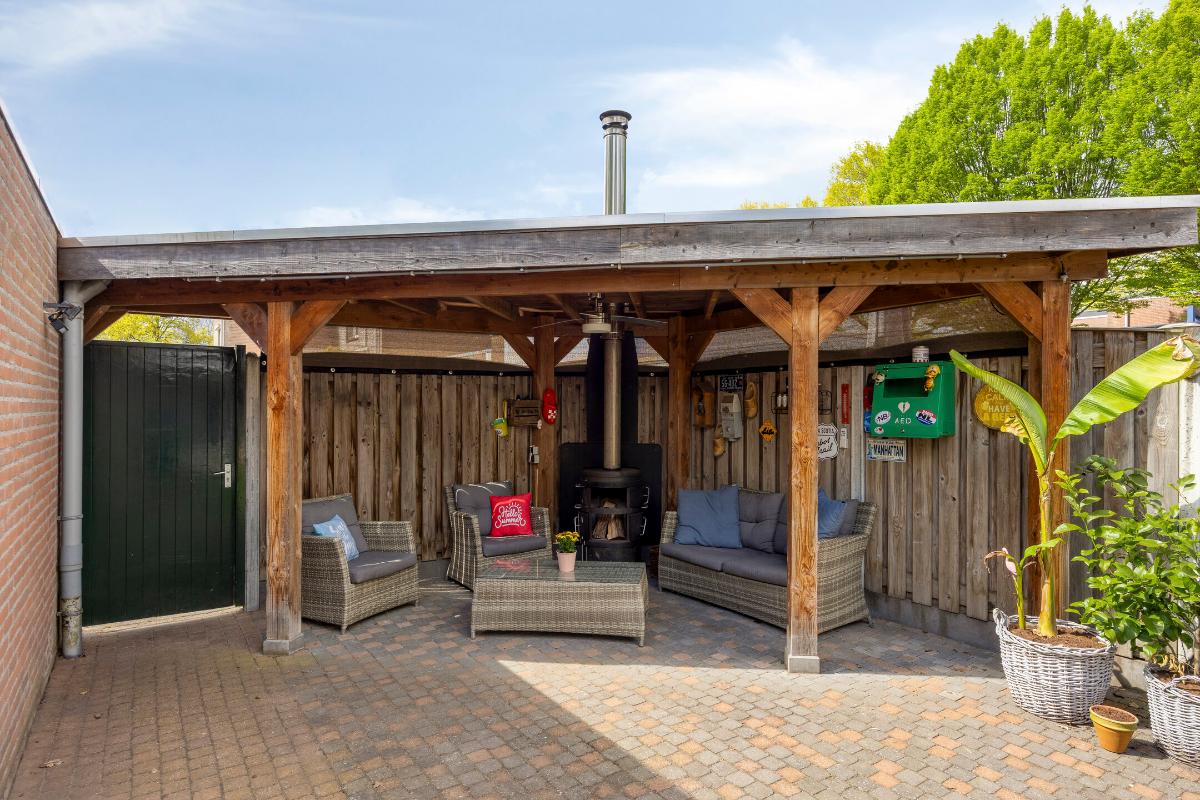Achter in de tuin bevindt zich een sfeervolle houten overkapping waar gedurende de warmere maanden van het jaar comfortabel buiten gezeten kan worden. De houtkachel (ter overname) maakt het plaatje compleet. Hierdoor is het ook op de koelere avonden heerlijk vertoeven. Een ideale plek voor gezellige momenten met familie en vrienden.