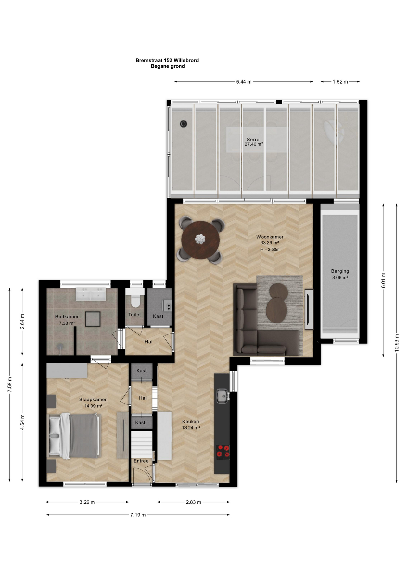 Begane grond met royale living en open keuken. Via de oprit en de onderhoudsvriendelijke voortuin bereikt u de entree aan de voorzijde van de woning. U komt binnen in een compacte hal met meterkast en trapopgang naar de 1e verdieping.