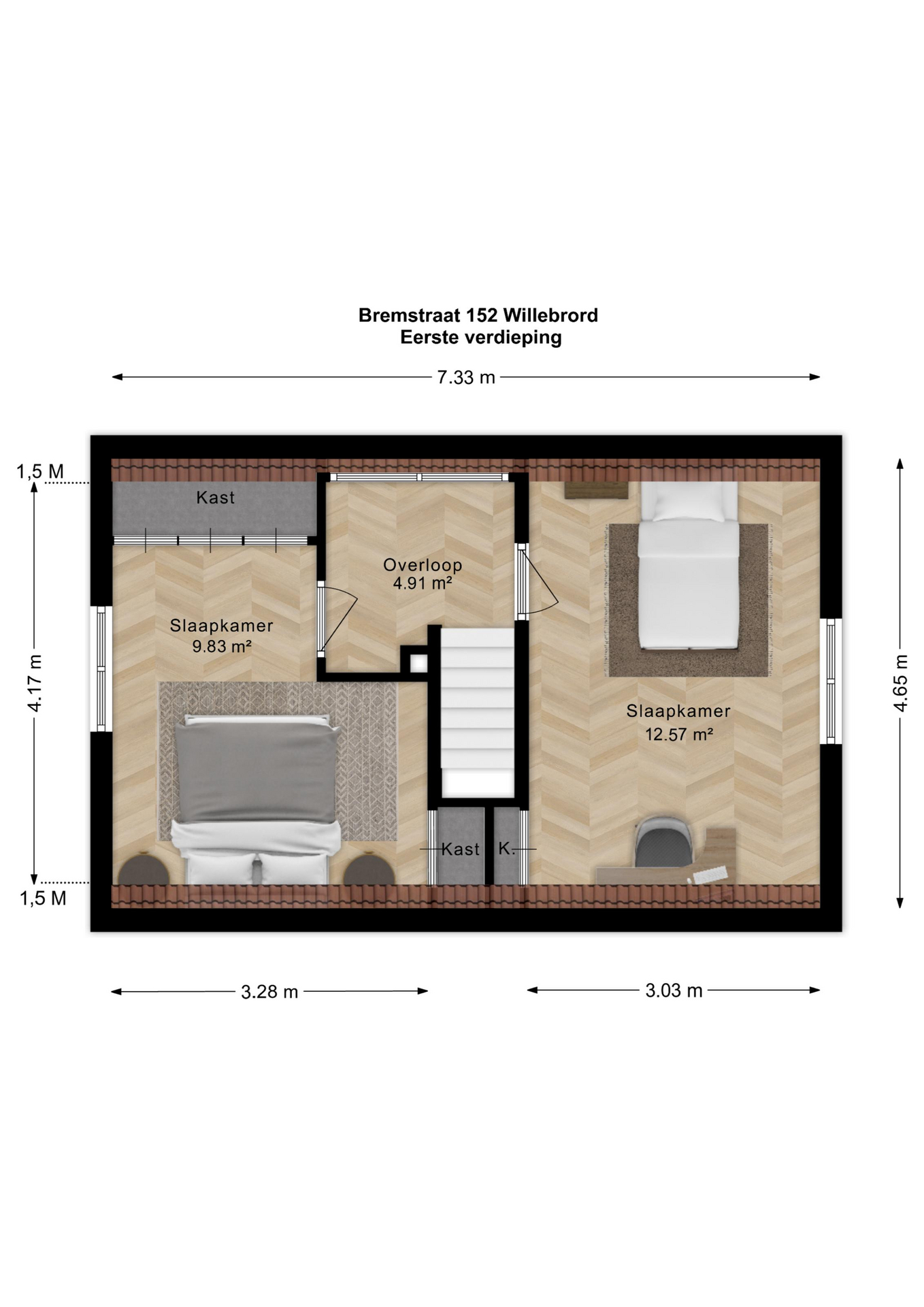 1e Verdieping met 2 royale slaapkamers Op de 1e verdieping vindt u 2 slaapkamers. De hele verdieping is voorzien van laminaatvloeren, vaste kasten en bergruimte en heeft door de vele ramen een heerlijke lichtinval.