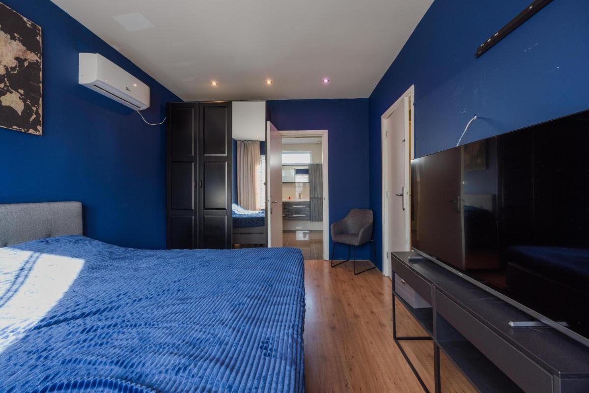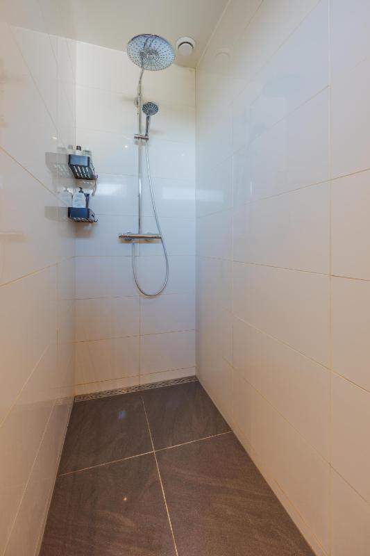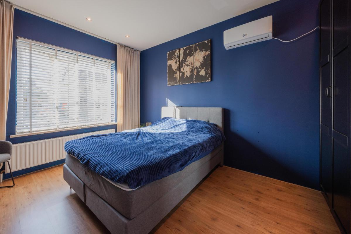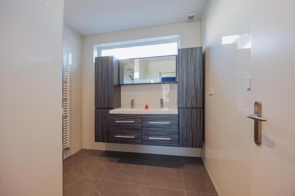Via de doorloop in de keuken komt u in de grote slaapkamer met en suite badkamer. Slaapkamer is gelegen aan de voorzijde en beschikt over een laminaatvloer, strakke wanden en plafond met inbouwverlichting en airconditioning. De badkamer is in 2016 geheel vernieuw, is volledig betegeld en beschikt over een dubbele wastafel in meubel, mechanische ventilatie, designradiator en inloopdouche.
