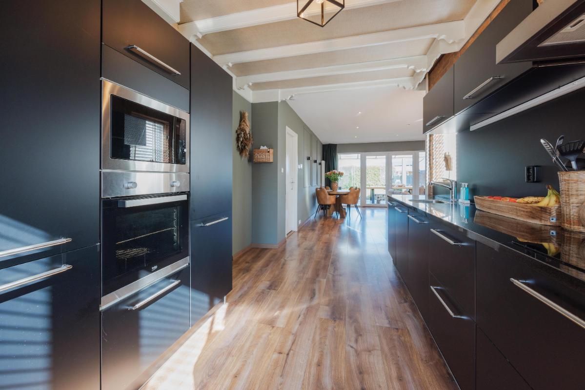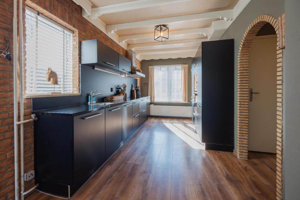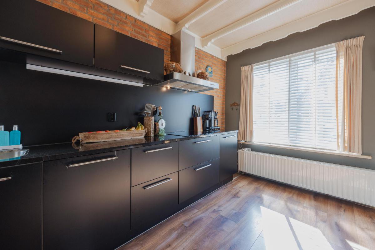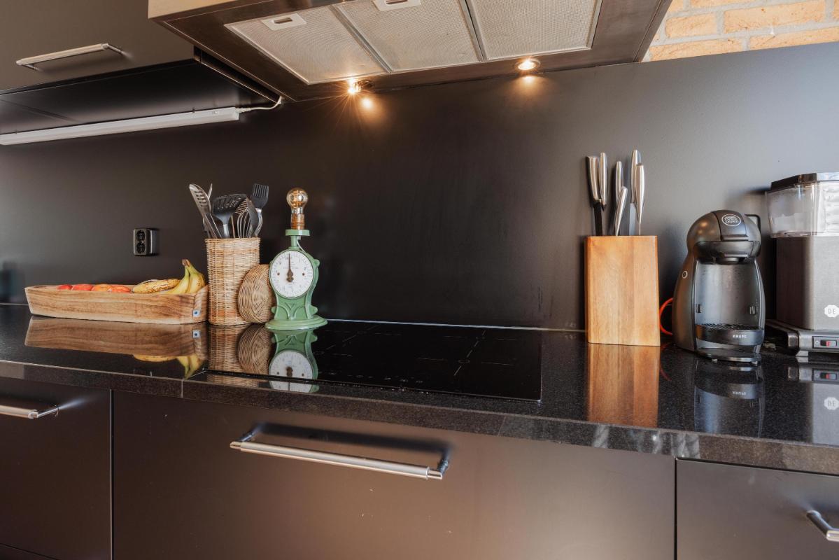 De open keuken is aan de voorzijde gelegen en uitgerust met onder- en bovenkasten, een natuurstenen aanrechtblad, een inductie kookplaat, oven, magnetron, vaatwasser, koelkast en afzuigkap. Vanuit de keuken heeft u toegang tot de woonkamer en een doorloop die leidt naar de slaapkamer en badkamer.