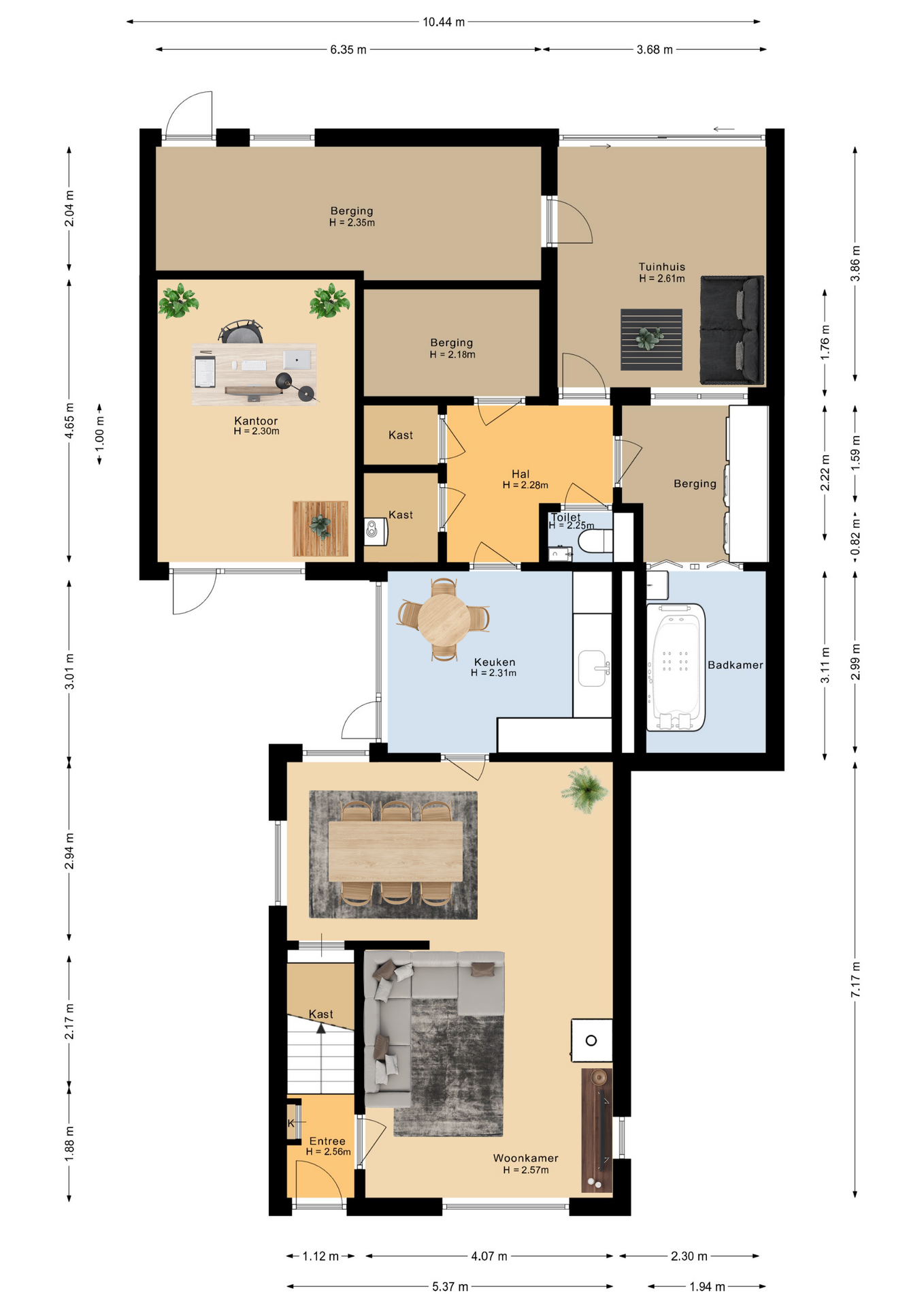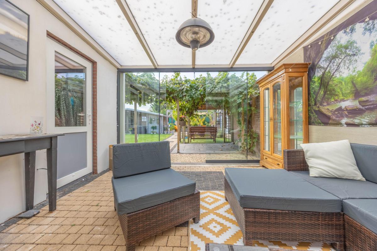 ________________________________________ Indeling Begane grond U betreedt de woning via de entree waar zich de trap naar de eerste verdieping bevindt. Tevens vind u hier de meterkast en de toegangsdeur naar de woonkamer. De sfeervolle woonkamer is voorzien van een houtkachel. Tevens is er een eetgedeelte in de woonkamer waar u toegang heeft tot een ruime kelderkast. De woonkamer is voorzien van een airco 2022. Vanuit de eetkamer komt u in de keuken. Deze keuken (2020) voorzien van inbouwapparatuur zoals een inductie kookplaat met 8 zones “Whirlpool six sence”, een oven, een vaatwasser (Miele), een koelkast en een afzuigkap (recirculatie). Tevens is er een composieten werkblad. Vanuit de keuken heeft u middels een deur toegang tot de zijkant van de woning. Hier is de extra gecreëerde kamer/ kantoor. Tevens is er vanuit de keuken een toegangsdeur naar de overige ruimtes. In de hal is een stookruimte (cv installatie, hybride warmtepomp en de verdeler/ pomp vloerverwarming), een bergkast, een inloopkast (voormalige badkamer), het toilet, de toegangsdeur naar de tuinkamer en naar de waskamer. Vanuit de waskamer is er toegang naar de badkamer. De badkamer (2020) is voorzien van een welness douche/ bad combinatie, een design radiator en een wastafelmeubel. De badkamer is uitgerust met een mechanisch ventilatiesysteem met vochtmeter. Vanuit de hal bereikt u de tuinkamer welke voorzien is van een glazen schuifpui (2020). De tuin is voorzien van een gazon, bestrating en zijn de verschillende bergingen bereikbaar.