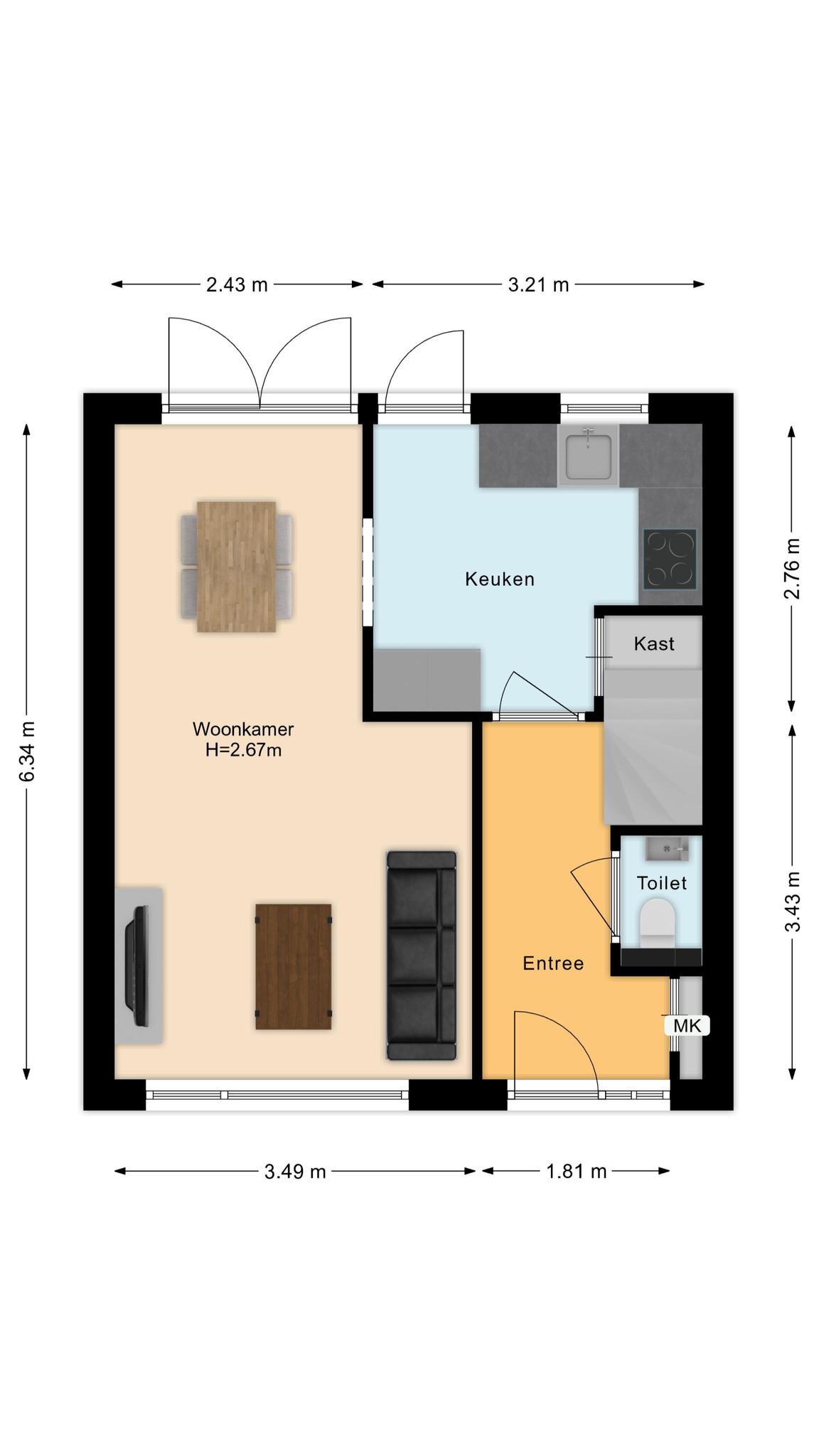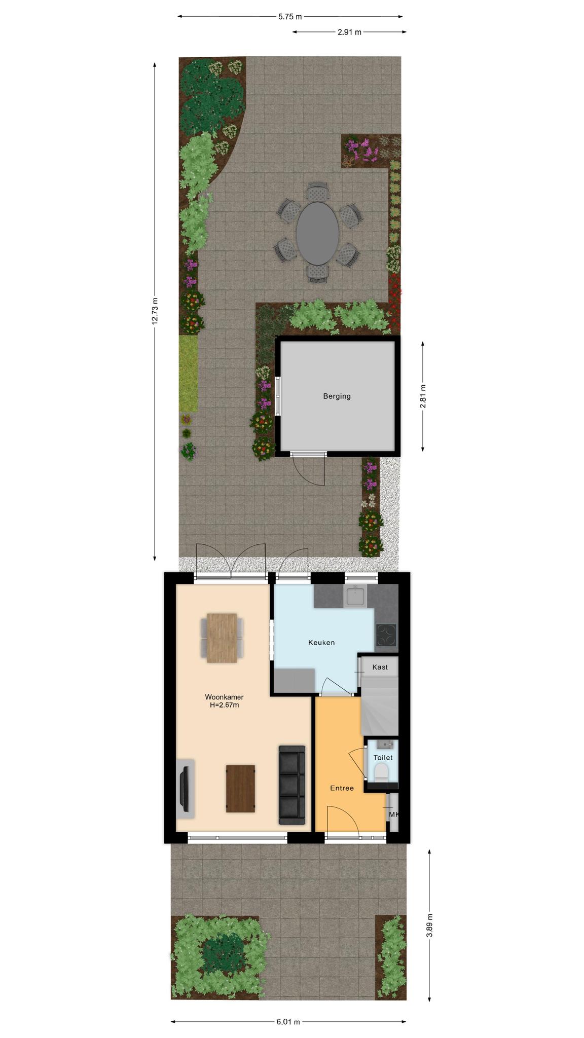INDELING Begane grond: Via de nette entree stap je binnen in de hal, waar je toegang hebt tot het moderne toilet en de ruime woonkamer. Zodra je de woonkamer betreedt, valt direct de aangename lichtinval op dankzij de grote raampartijen en de openslaande deuren die uitkomen op de zonnige, op het zuiden gelegen achtertuin.