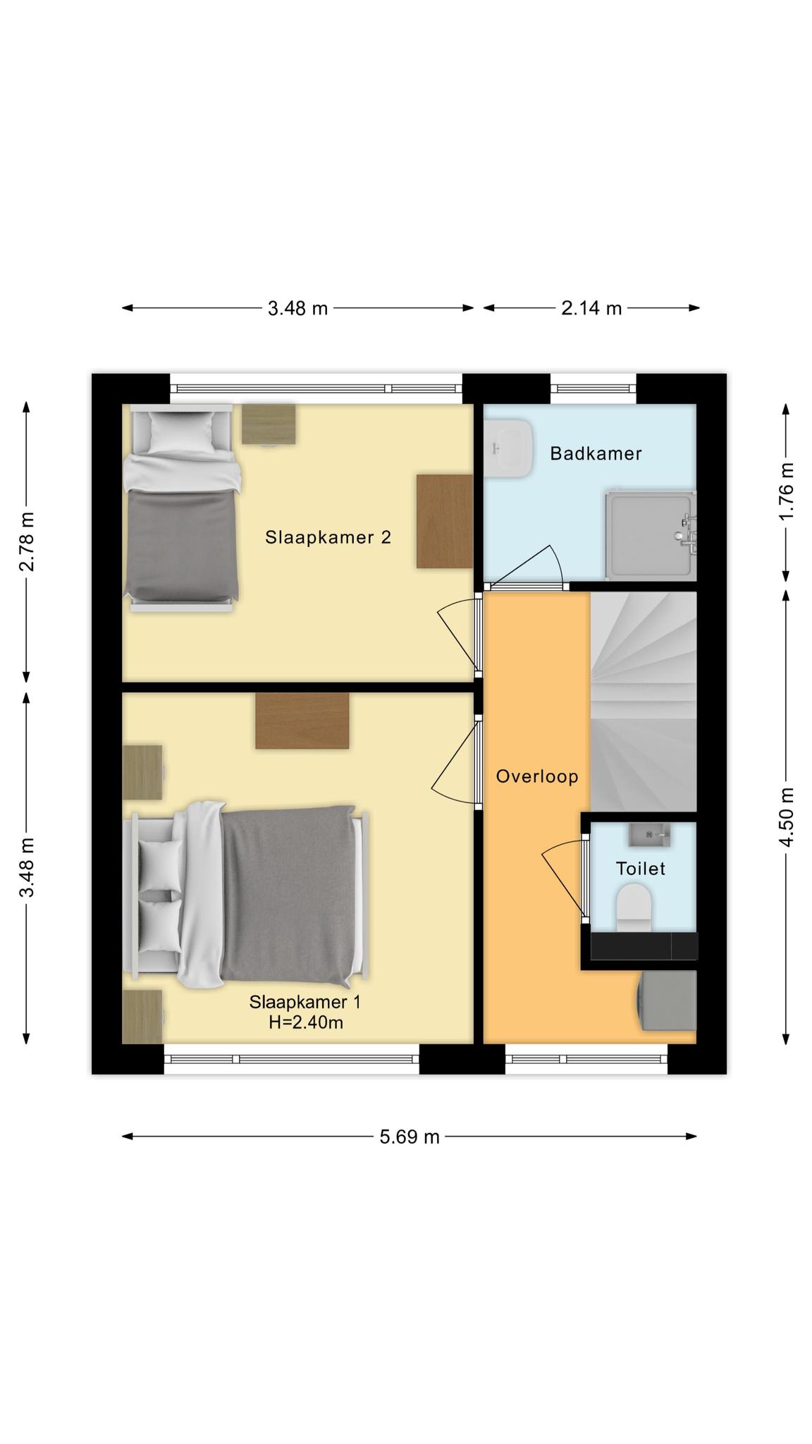 De hoofdslaapkamer bevindt zich aan de voorzijde van de woning en is smaakvol afgewerkt met een mooie laminaatvloer, strak gestuukte wanden en plafonds. Ook de tweede slaapkamer, gelegen aan de achterzijde, is met zorg afgewerkt in dezelfde stijl en vormt daarmee een rustige en comfortabele ruimte. De gehele verdieping ademt een verzorgde en eigentijdse sfeer.