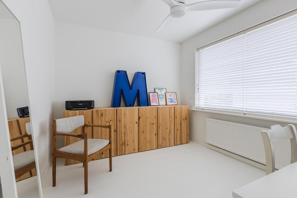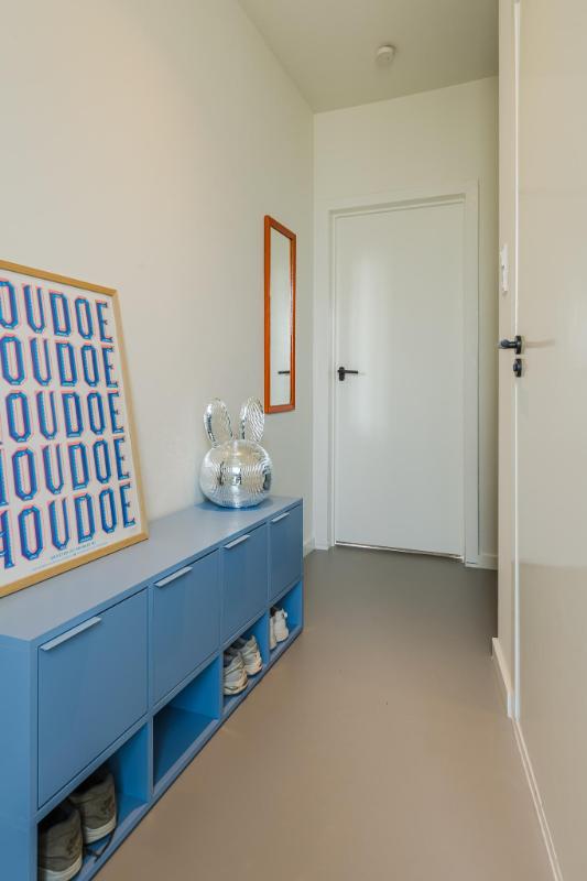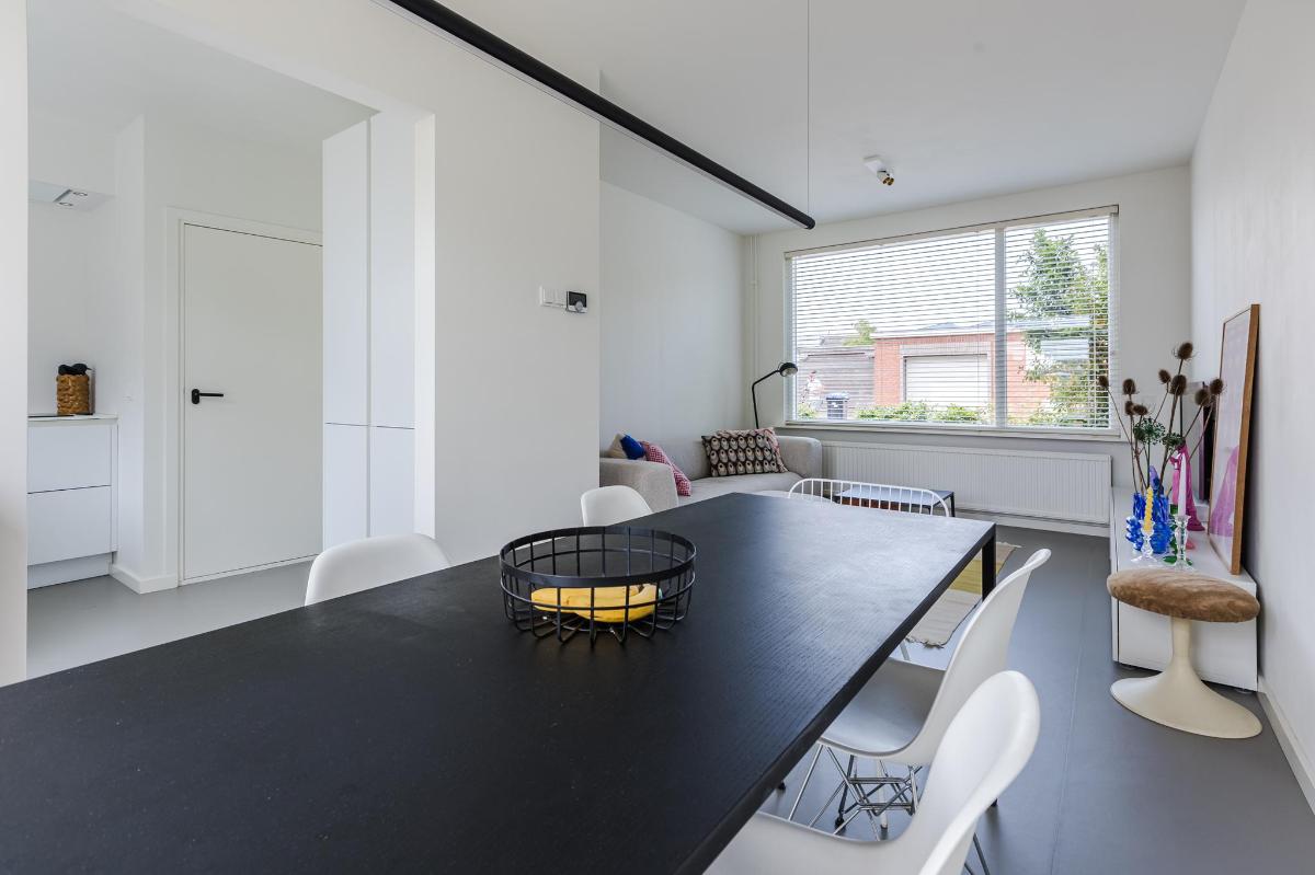 De gehele begane grond is strak afgewerkt met glad gestuukte wanden en plafonds, wat bijdraagt aan de frisse, moderne uitstraling van deze instapklare woning.