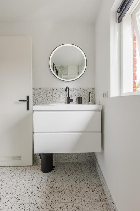 Eerste verdieping: Op de eerste verdieping kom je via de overloop in twee slaapkamers en de badkamer. De badkamer is gelegen aan de achterzijde van de woning en heeft een moderne uitstraling. Deze is uitgerust met een douchecabine en een stijlvol wastafelmeubel. Op de overloop bevindt zich een separaat toilet, wat zorgt voor extra comfort en gebruiksgemak op deze verdieping.