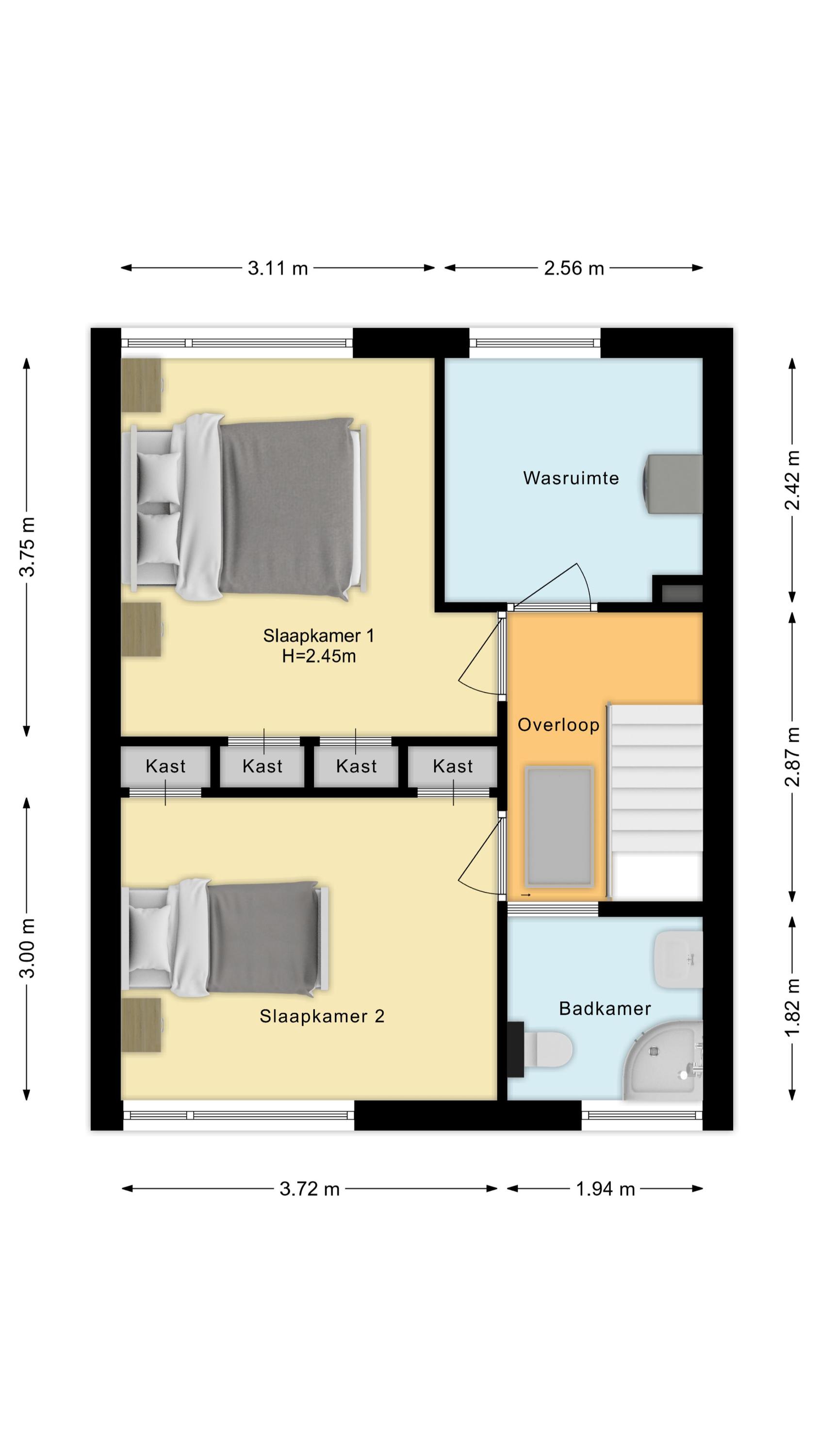 Eerste verdieping Op de eerste verdieping vind je een ruime overloop die toegang biedt tot drie slaapkamers en de badkamer. Via een vlizotrap is de tweede verdieping bereikbaar.