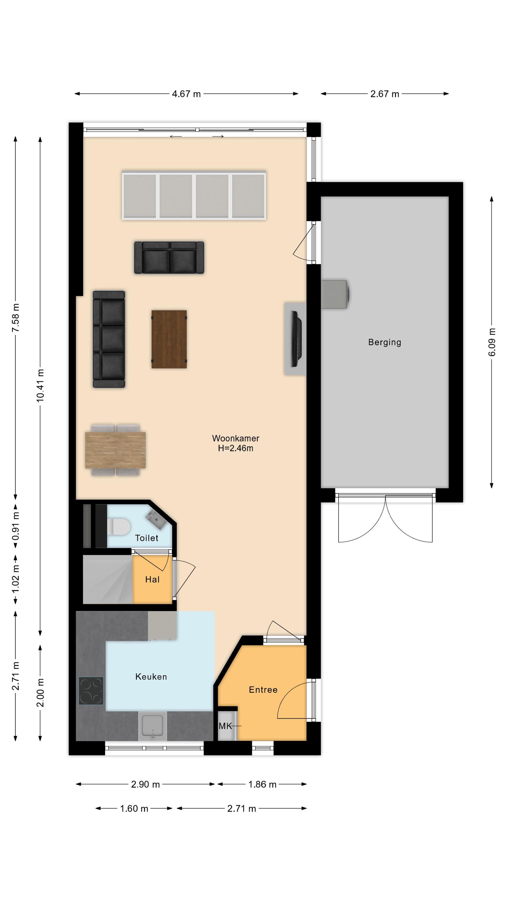 Begane grond: Wanneer je de woning binnenstapt, kom je in de hal die toegang geeft tot de woonkamer.