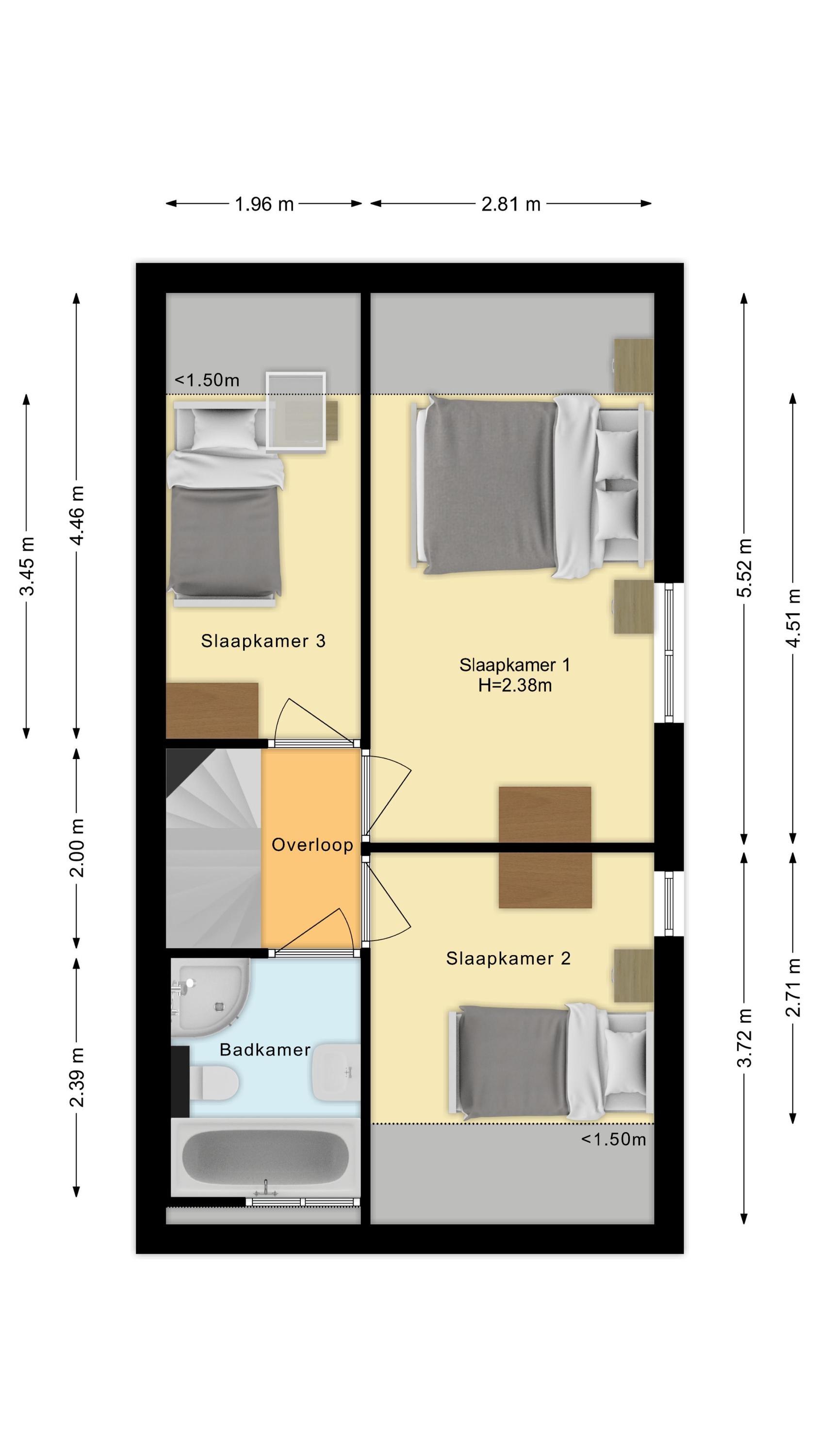 Slaapkamer 1: is de grootste en bevindt zich aan de achterzijde van de woning. Slaapkamer 2: ligt aan de voorzijde en biedt eveneens een fijne, lichte ruimte. Slaapkamer 3: ligt aan de achterzijde en beschikt bovendien over een dakraam dat voor extra daglicht en een prettige sfeer zorgt.